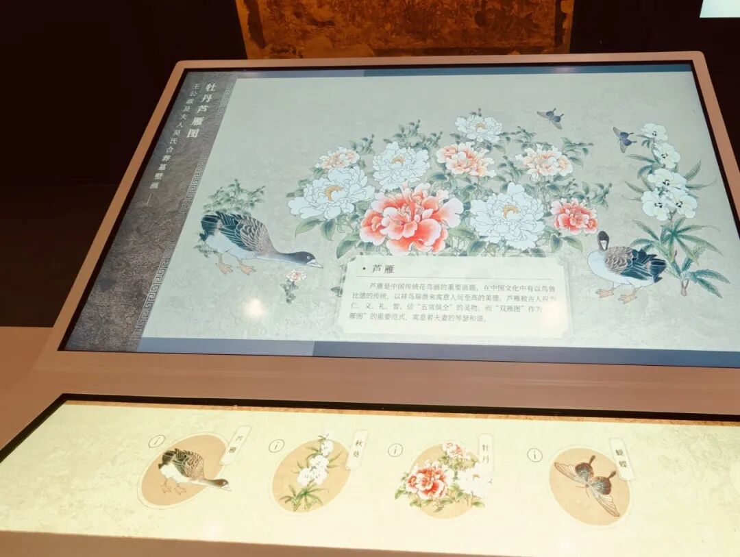 为让观众深入领略这幅壁画的艺术魅力,展区特别设置了多媒体互动装置。观众可通过触摸屏细细品读画中每一个细节——从牡丹的层层花瓣到芦雁的纤细羽毛,在现代科技与传统艺术的交融中,感受大唐盛世的审美情趣与文化气象。