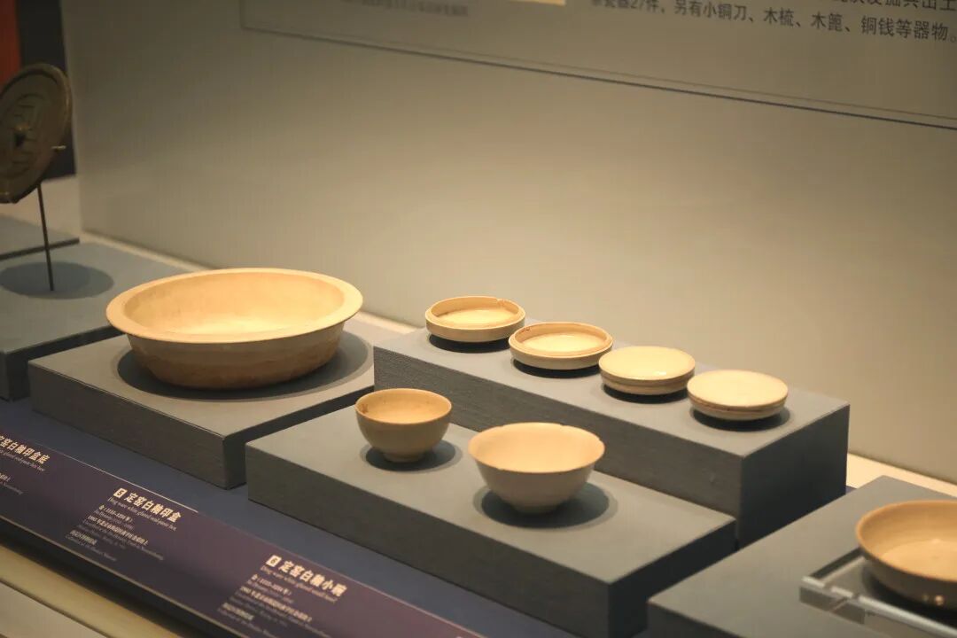 金代南辛庄墓葬出土的定窑系白瓷令人叹为观止:白釉瓜棱执壶造型精巧,白釉刻莲纹洗清新雅致,白釉鸳鸯荷莲纹菊瓣盘印花清晰如浮雕。成套的白瓷小罐置于妆奁,与黑釉茶盏、盏托一同,再现了宋金时期士大夫阶层优雅的日常生活与审美趣味。