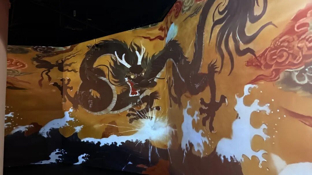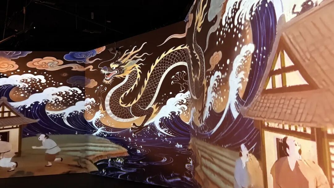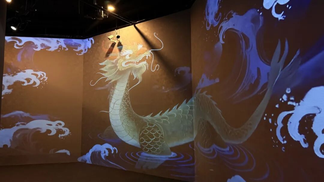 “永定河传说”数字文化艺术展,分别从历史、故事和生态三个层面出发,以科普永定河全流域知识、展现永定河北京段沿线文化风采为主线,精心策划“大河汤汤——从远古走来的永定河”、“瑰丽多彩——流传千年的民间传说”和“风景如画——两园一河的生态画卷”三个展示部分,通过AI文生图作品、地理地图、古画印刷展品和装置艺术等展示方式,使观众能够更好地了解永定河的自然与人文历史,并畅游在妙趣横生的传说故事当中。