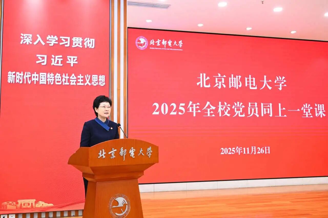 为深入学习贯彻习近平新时代中国特色社会主义思想,持续深化党的创新理论武装,11月26日下午,北京邮电大学开展2025年下半年全校党员“同上一堂课”第二课,7000余名师生党员在海淀校区、沙河校区、海南校区等46个会场集中观看学习由中共中央党校(国家行政学院)科研部主任陈曙光教授主讲的《深入学习贯彻习近平新时代中国特色社会主义思想》视频课程。北京化工大学原党委书记王芳、教育部党建工作联络员林志华、兄弟高校有关同志到校指导,校党委书记续梅主持党员集中培训。