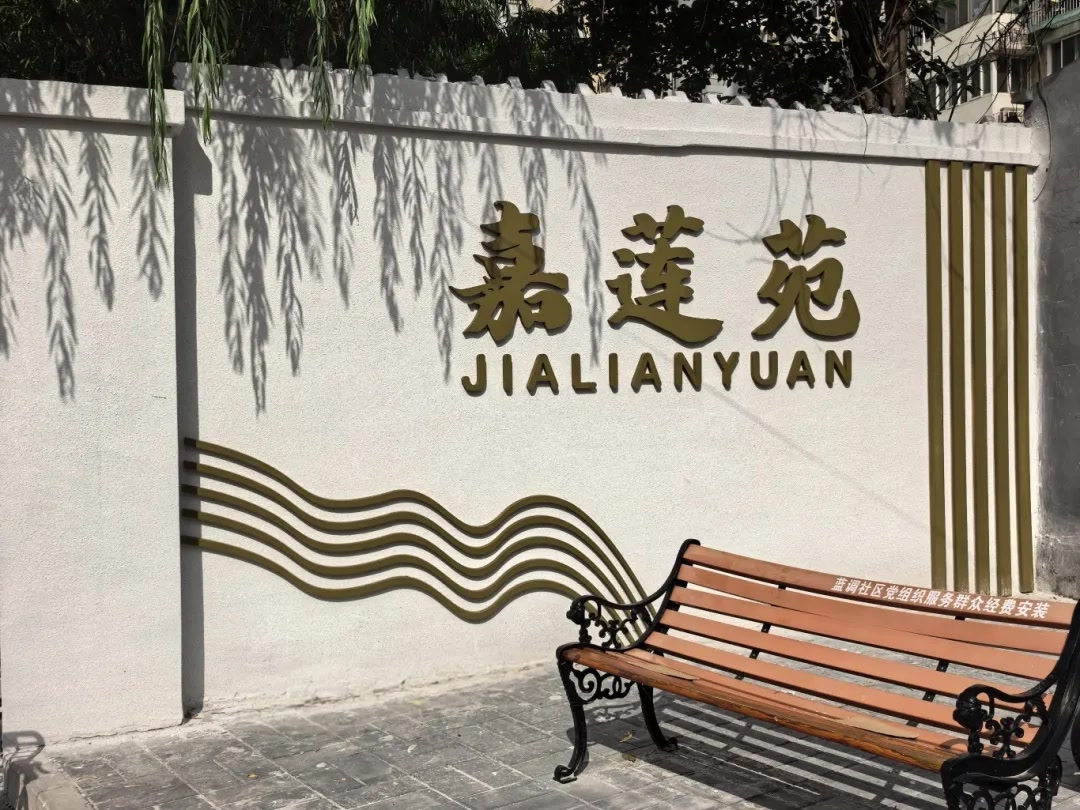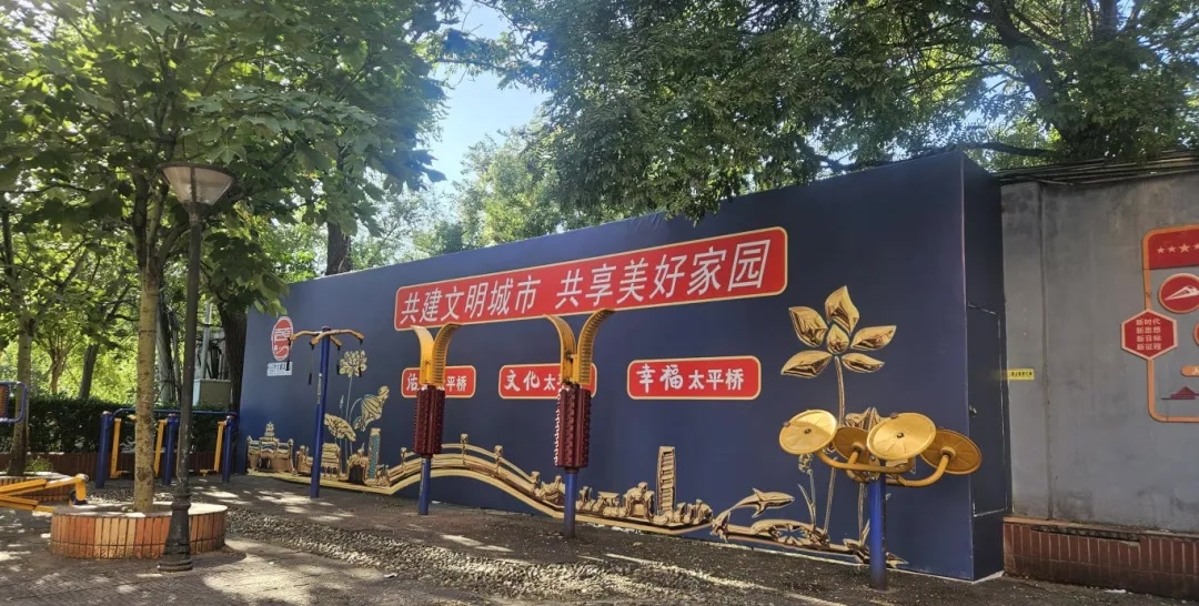 以此为契机,蓝调社区党委还对因长期风吹日晒、雨水侵蚀导致墙皮大面积脱落、斑驳不堪东西门外墙进行了整体修缮。东门外墙涂刷为浅灰色,配合金棕色的“嘉莲苑”三个大字与装饰线条,简约雅致;西门外墙,则整体覆盖了深蓝色喷涂画布,绘“活力太平桥、文化太平桥、幸福太平桥”主题文化图案,既提升了视觉效果,也增强了地区的文化归属感。