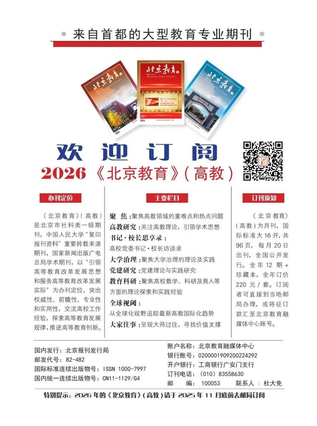 《北京教育》(高教)以 “引领高等教育改革发展思想和服务高等教育改革发展实际”为办刊定位,突出权威性、前瞻性、专业性和实用性,交流高校工作经验,探索高等教育发展规律,推进高等教育创新。