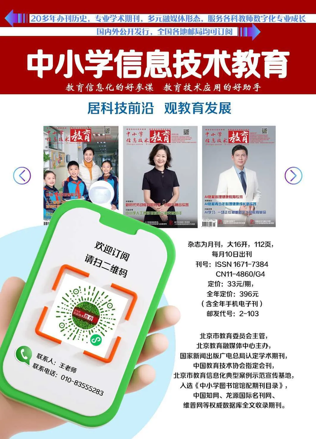 作为面向中小学信息技术教育的专业刊物,《中小学信息技术教育》杂志拥有硬核“身份背书”——国家新闻出版署认定学术期刊、北京市教育信息化典型案例示范宣传基地、中国教育技术协会指定会刊,还入选《中小学图书馆馆配期刊目录》,被中国知网、维普网等权威平台全文收录。无论您是学科老师想提升信息科技素养,还是教育管理者关注教育信息化创新发展,这本杂志都是您的得力助手,其专业性、前瞻性、指导性、实践性、可操作性备受行业认可。