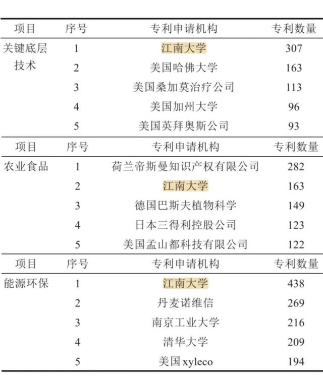 据《2025中国工业生物技术发展白皮书》等最新权威统计研究显示,“十四五”期间,江南大学在全球合成生物技术创新格局中展现出卓越竞争力与影响力。作为建有“轻工技术与工程”国家“双一流”建设学科的工科强校,江南大学在我国合成生物技术领域近五年(2021-2025年)专利数排名第一(表1);成果转化活跃度突出,专利转让与许可数量持续领先(表2)。另,据中国科学院成都文献情报中心主笔的《合成生物学》期刊特约评述《合成生物学研发竞争态势对比分析》(合成生物学,2025,6(4): 940-955),江南大学在合成生物技术的“关键底层技术”与“能源环保”两大领域的专利数量位列全球第一,“农业食品”领域专利数排名全球第二(表3)。