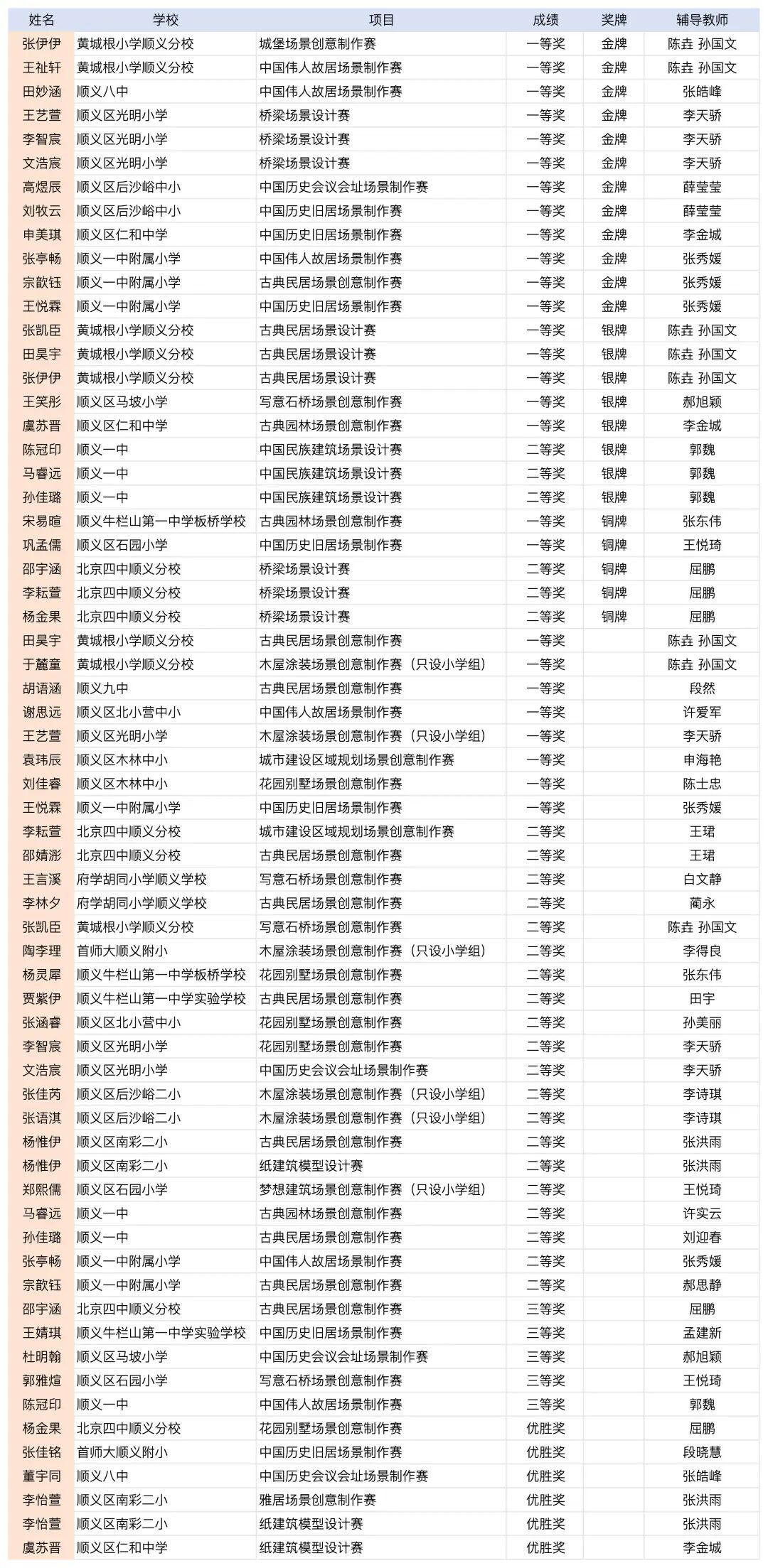 顺义学子在各个赛场尽显风采。黄城根小学顺义分校的张伊伊独揽城堡场景创意制作赛金牌与古典民居场景设计赛银牌,该校王祉轩和顺义八中的田妙涵则在中国伟人故居场景制作赛中夺金。光明小学王艺萱、李智宸、文浩宸在桥梁场景设计赛中携手摘金,用精巧的设计展现了对桥梁结构与美学的深刻理解。后沙峪中小的高煜辰在中国历史会议会址场景制作赛中脱颖而出,该校刘牧云和仁和中学的申美琪则在中国历史旧居场景制作赛中摘金。顺义一中附属小学的张亭畅、宗歆钰、王悦霖三名同学分别在不同历史建筑主题赛事中夺金。顺义一中、北京四中顺义分校、石园小学等校的参赛选手也均有优异表现。