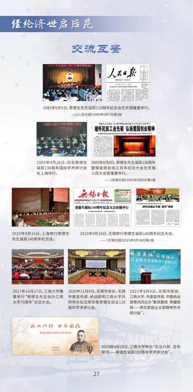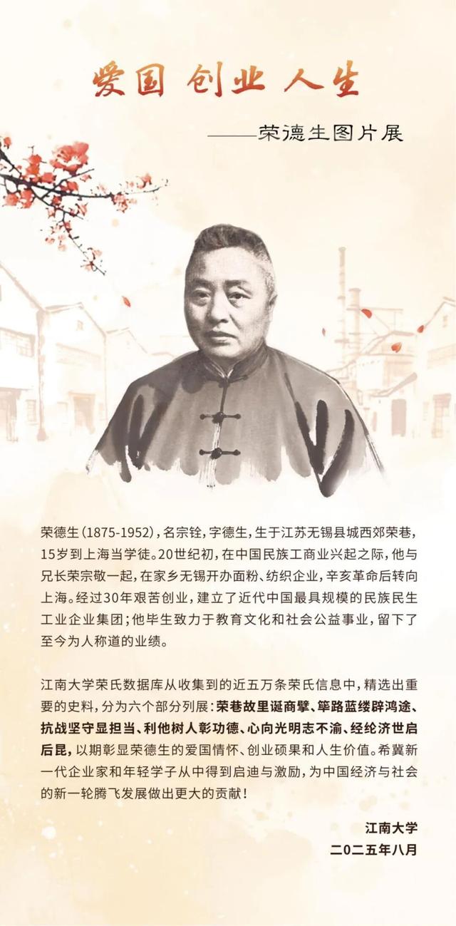2025年,正值荣德生先生诞辰150周年。今年下半年,江南大学专门举办“实业兴邦 百年荣范——荣德生诞辰150周年学术研讨会”和“爱国、创业、人生——荣德生图片展”,追忆荣德生的爱国情怀、创业硕果和人生价值,启迪激励年轻学子和新一代企业家,弘扬爱国之情和报国之志。