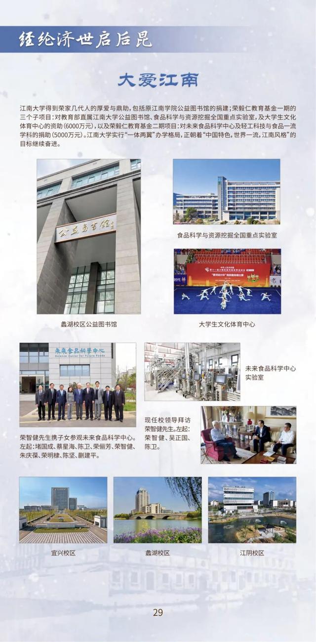 荣德生先生临终前仍叮嘱子孙,“财富取之于社会,须用之于社会”。一直以来,荣德生先生、荣毅仁先生、荣智健先生等几代人心系故乡、为了国家的繁荣昌盛襄助教育、培育人才。1947年至1953年,荣德生先生倾力在家乡无锡创办私立“江南大学”。1985年,荣毅仁同志亲自为恢复的江南大学揭牌,并担任名誉董事长。期间,荣智健先生以父亲的名义为江南大学捐建了公益图书馆和公益电脑中心,并设立了“教师海外留学基金”。1994年5月,荣智健先生秉承家风、心系桑梓,又出资100万美元,设立“荣毅仁教育奖学金”,为家乡的教育事业出力劳心。