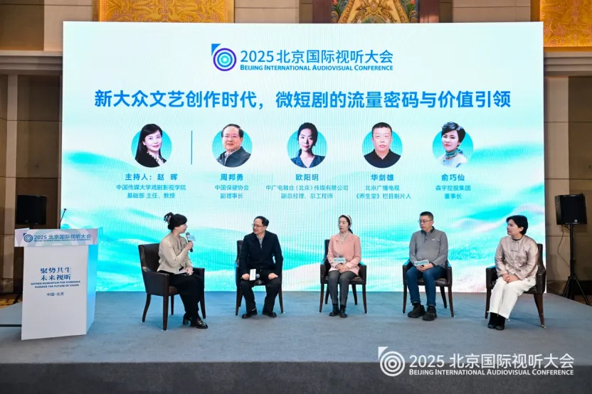 对话访谈环节由中国传媒大学戏剧影视学院基础部主任、教授赵晖主持。中国保健协会副理事长周邦勇,中广电融合(北京)传媒有限公司副总经理、总工程师欧阳玥,北京广播电视台《养生堂》栏目制片人华剑雄,森宇控股集团董事长俞巧仙围绕健康科普与微短剧的碰撞,以“新大众文艺创作时代,微短剧的流量密码与价值引领”为题展开了深入的探讨。
