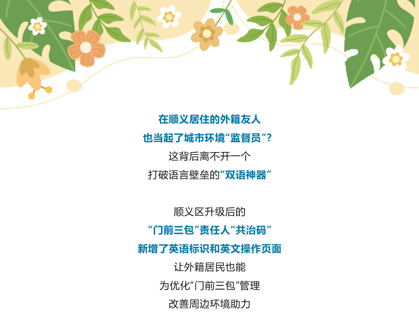 “‘共治码’此次升级,标志着顺义区‘门前三包’从‘基础管理’迈向‘品质提升’阶段。”顺义区城市管理委环境建设管理科科长刘磊表示,引入外籍居民参与监督,既为环境改善注入多元力量,也让在顺义的外籍友人增强归属感,真正实现共建共治共享的治理目标。