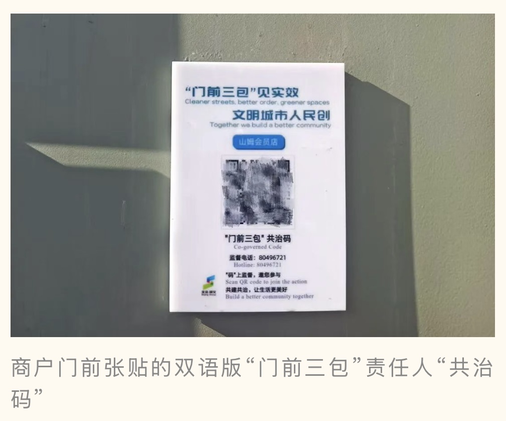 在会展誉景小区,双语志愿者正认真教外籍居民使用双语版“门前三包”责任人“共治码”。来自荷兰的居民赛承佐,刚在小区外发现一家商户门前随意摆放着椅子,影响环境整洁,在志愿者的指引下,他扫码、拍照、提交,整个过程不到一分钟。“不用翻译软件,拍张照、简单描述就能提交问题,特别高效。我会把这个‘神器’推荐给身边的外国朋友,让大家都能为我们美好的生活环境贡献一份力量。”赛承佐说。