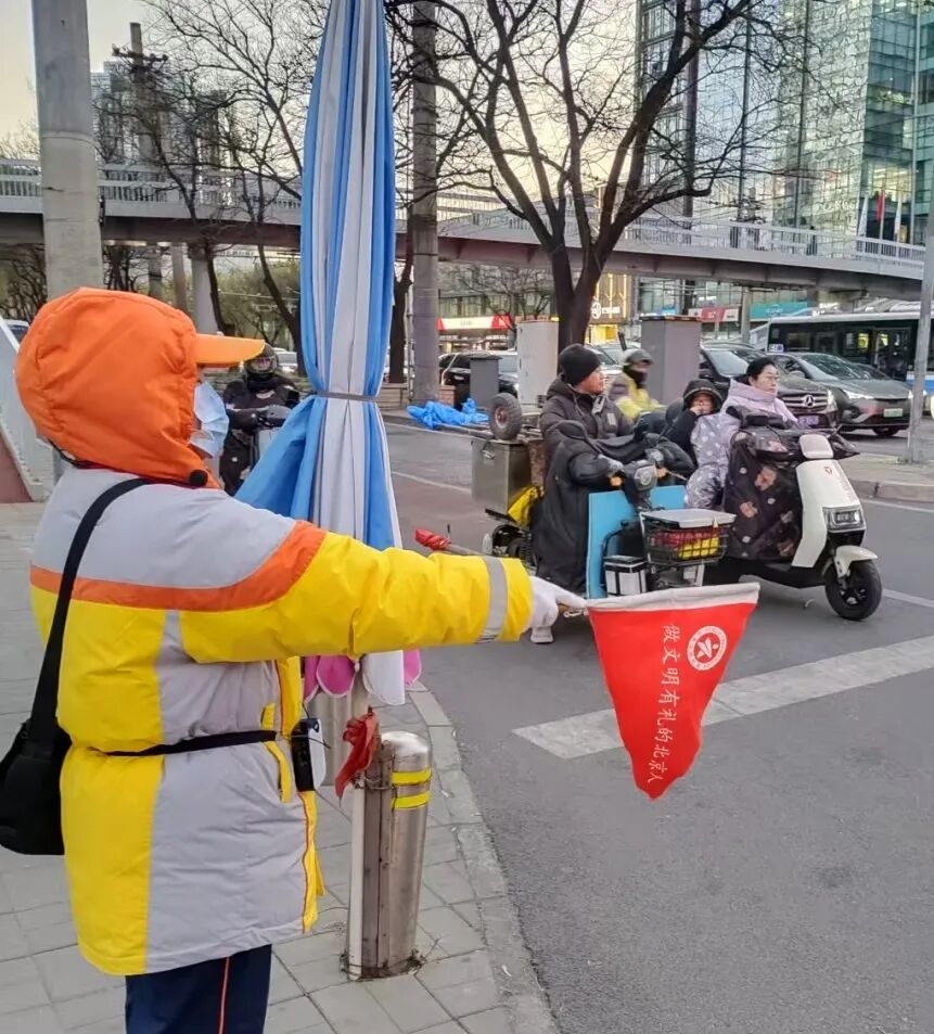 早晚高峰,街道公共文明引导员维护路口秩序,倡导居民有序乘车、文明礼让,使不文明交通行为减量。