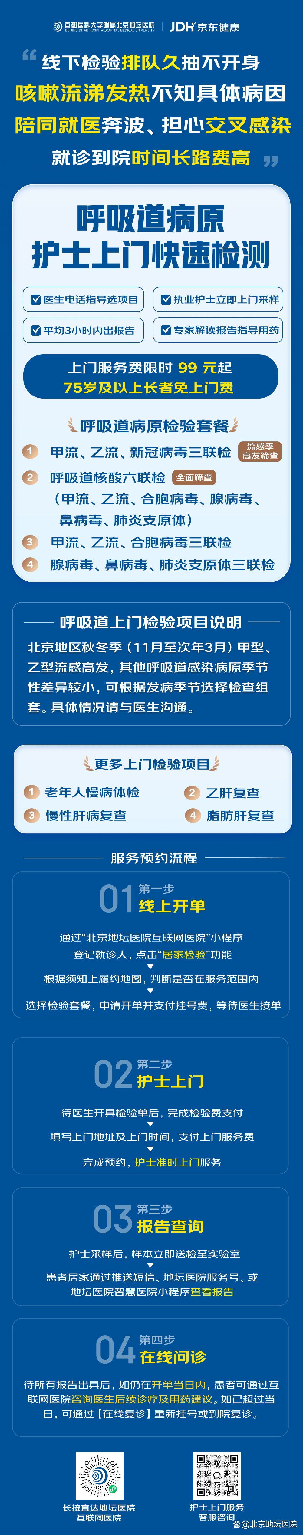 12月1日,首都医科大学附属北京地坛医院联合京东健康,正式推出“呼吸道病原3小时护士上门快速检验”服务。作为北京市首家开展此项服务的医院,依托地坛医院感染性疾病优质医疗资源及多实验室网络化布点,该项目构建起覆盖北京中心城区大部分区域的呼吸道传染病居家诊断网络,搭建起“互联网医院下单-护士上门采样-样本快速检测-线上查看报告-医生在线诊断-药品配送到家”全流程闭环服务模式。足不出户,百姓3小时内即可方便快捷地享受到地坛医院优质检验资源及医疗服务,不仅真正实现健康服务“零距离”,更重构了呼吸道传染病防控新格局,让传染病智慧防控再提速。