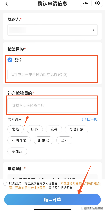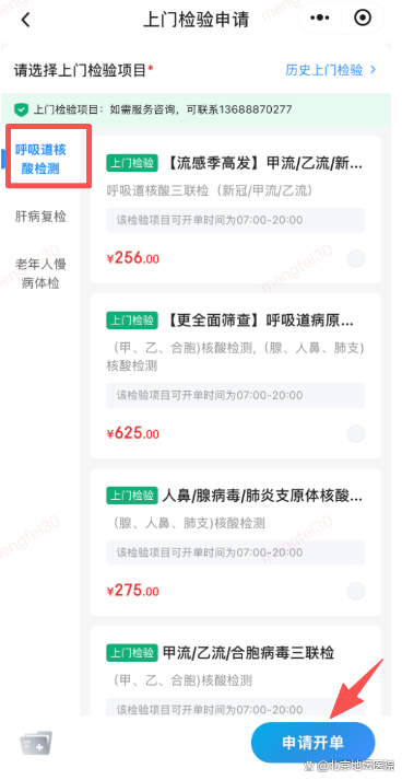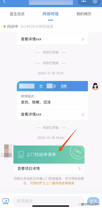 1. 选择合适的呼吸道上门检验项目,确认预约须知且完善病情信息后,支付挂号费申请开单(支持北京医保支付)。待医生接诊后进行电话问诊,沟通项目适配性后,开具检验单。患者可通过浮标进入医生问诊对话页,点击申请单支付检验费,完成检验开单。
