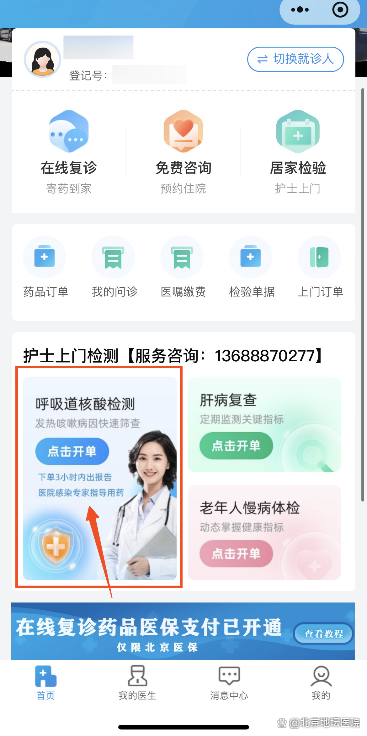 轻松搞定预约:微信搜索“北京地坛医院互联网医院”,登录小程序并绑定就诊人后,点击“呼吸道核酸检测”功能入口,按流程指引操作即可轻松完成预约。