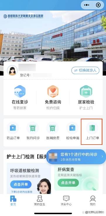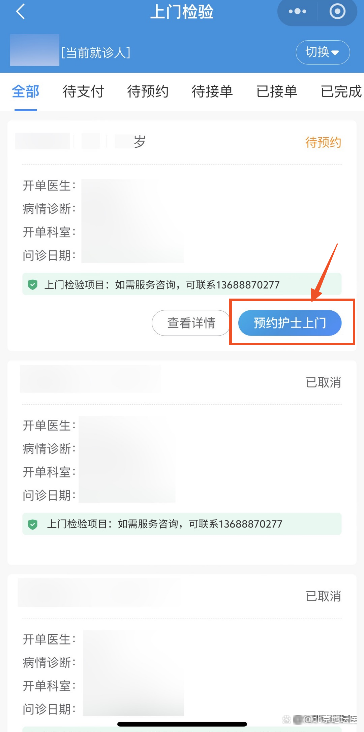 2.进入【上门订单】界面,查看开单记录。按需预约护士上门采样地点与时间(支持立即上门),支付服务费,居家等待护士上门采样。