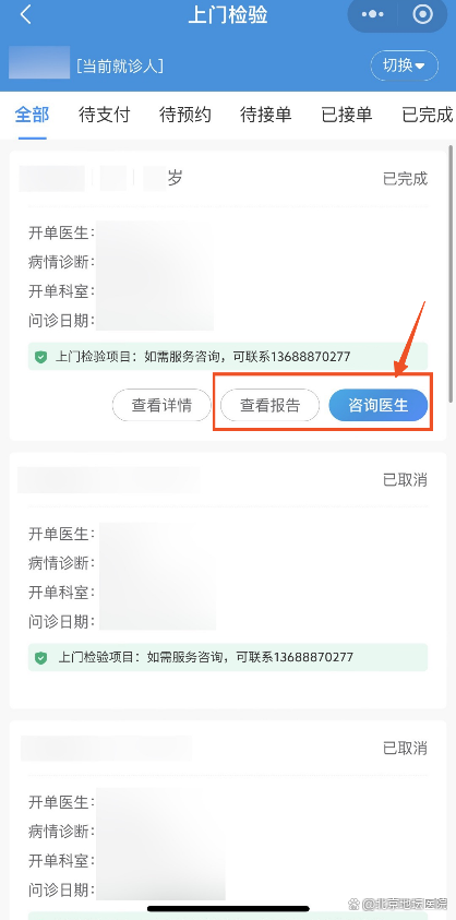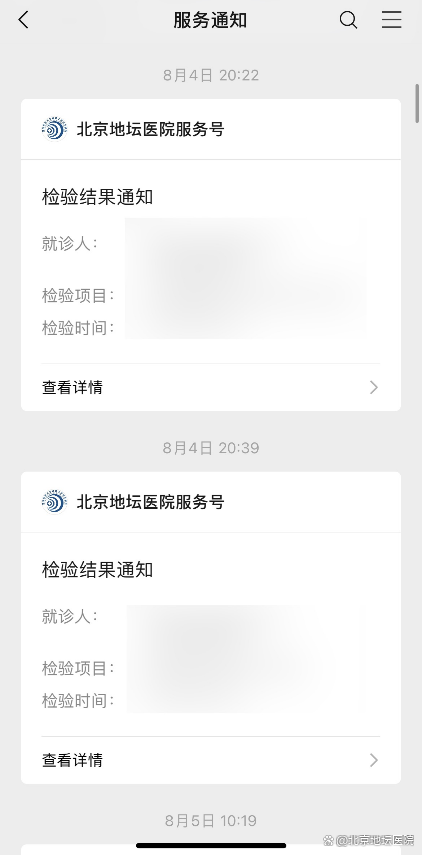 4.开单后及时关注微信【北京地坛医院服务号】,结果出具时将自动推送消息提示。待报告出具,如仍在开单当日内,患者可一键回诊咨询医生,由地坛医院医生提供在线专业诊疗及用药指导,足不出户完成全程就医。