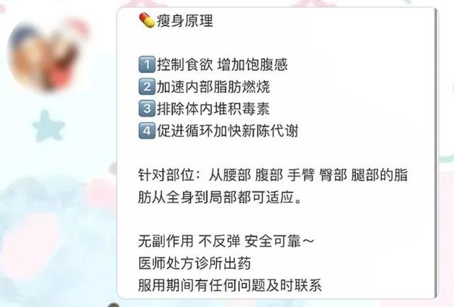 经调查,该团伙通过微信与购买者沟通,针对不同客户定制“等级套餐”,并强调“需正常三餐,多喝水”,看似轻松减肥,实则通过药物副作用达到抑制食欲的目的制造“瘦身假象”,并将药物副作用美化为“消耗热量燃脂的过程”来博取购买者的信任。