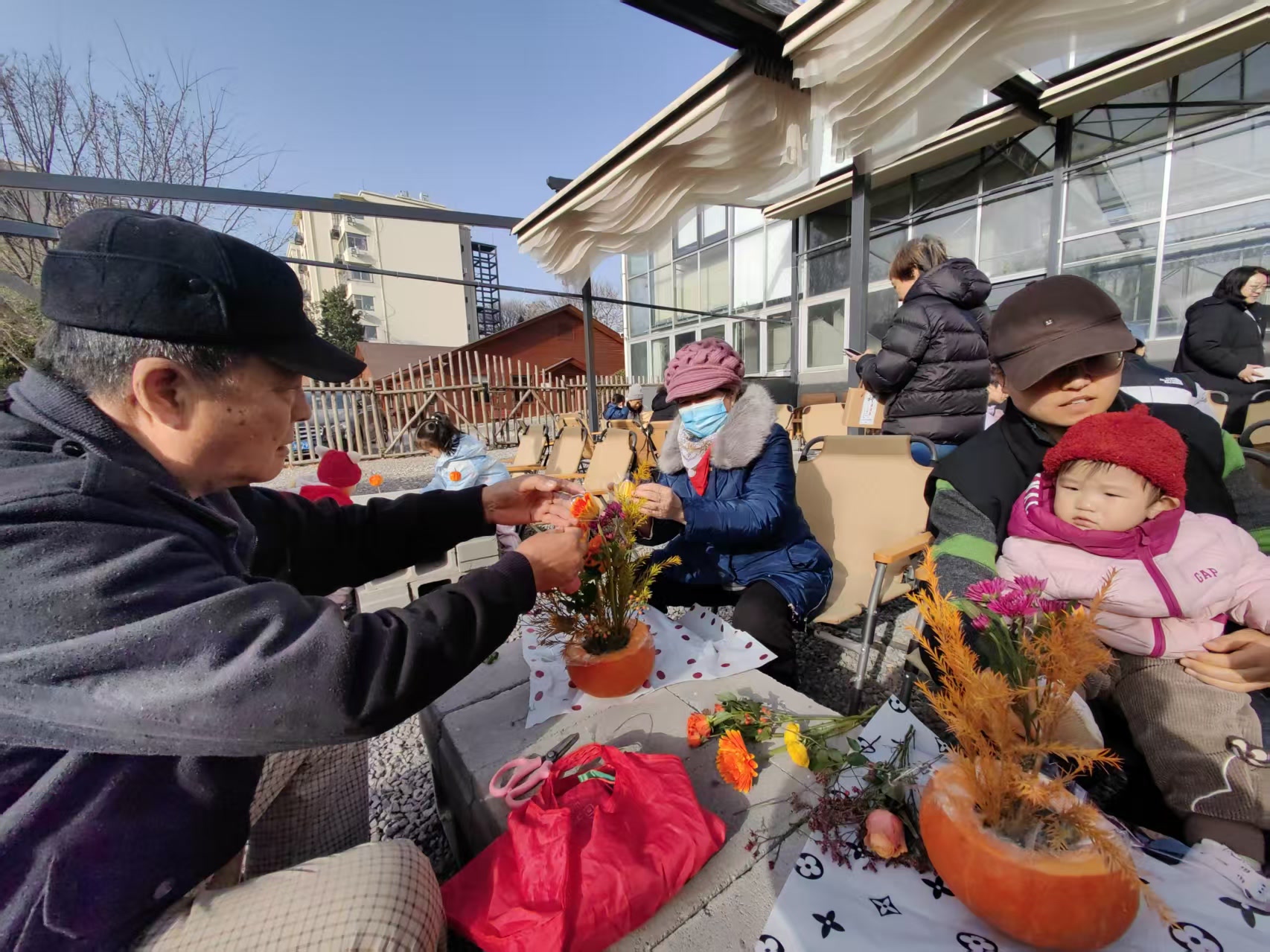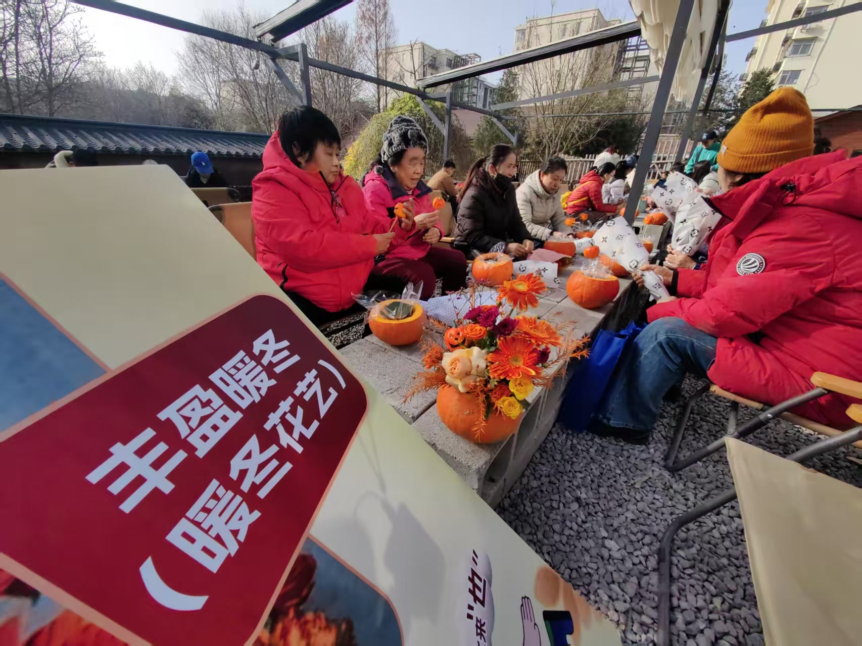 室外露台的“暖冬花艺”区域,居民们将象征硕果的小南瓜、浆果与代表五谷丰登的金色麦穗巧妙搭配,创作出温暖丰饶的冬日花艺作品。林下区域的“植物压花杯垫”体验区,居民将干花、松果片等冬日元素封存于杯垫中,制作出独一无二的冬日纪念。