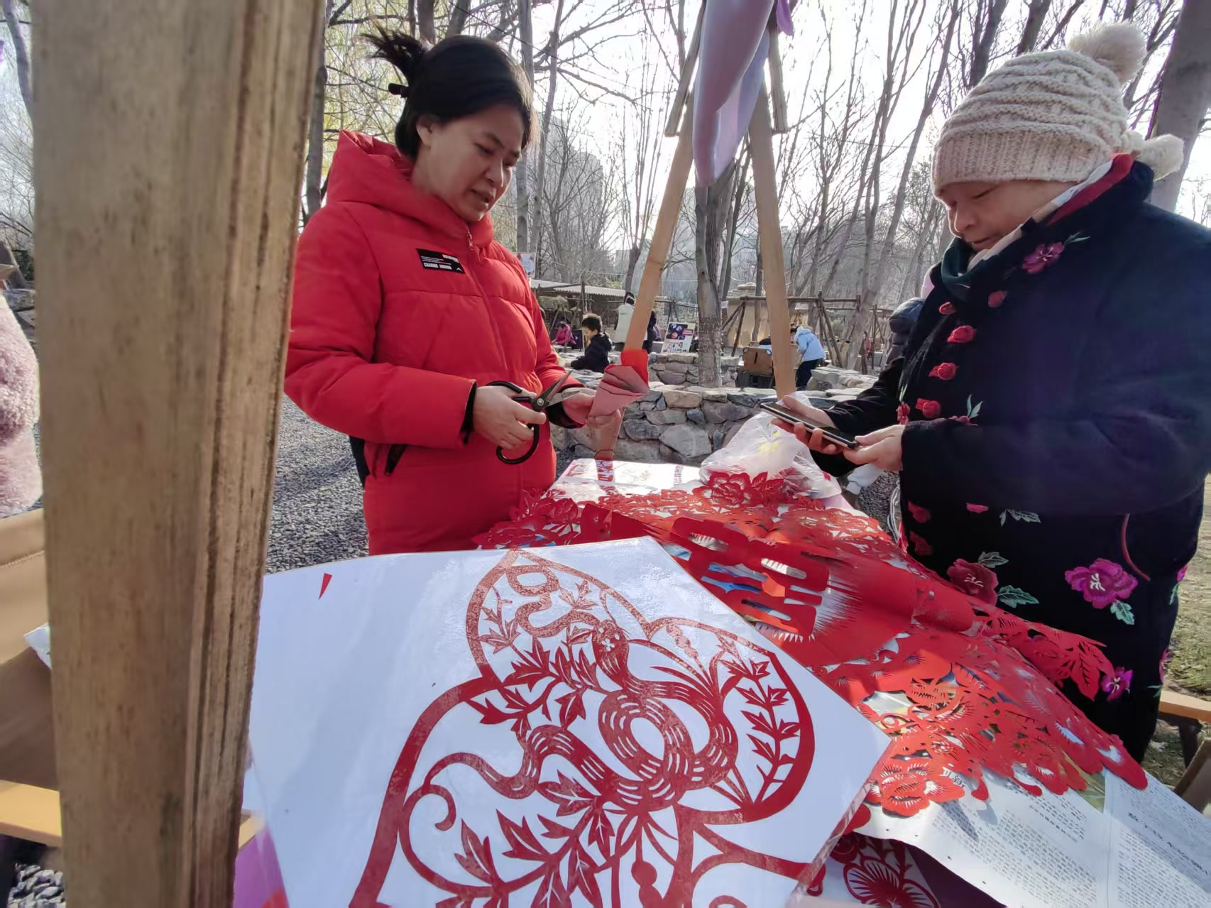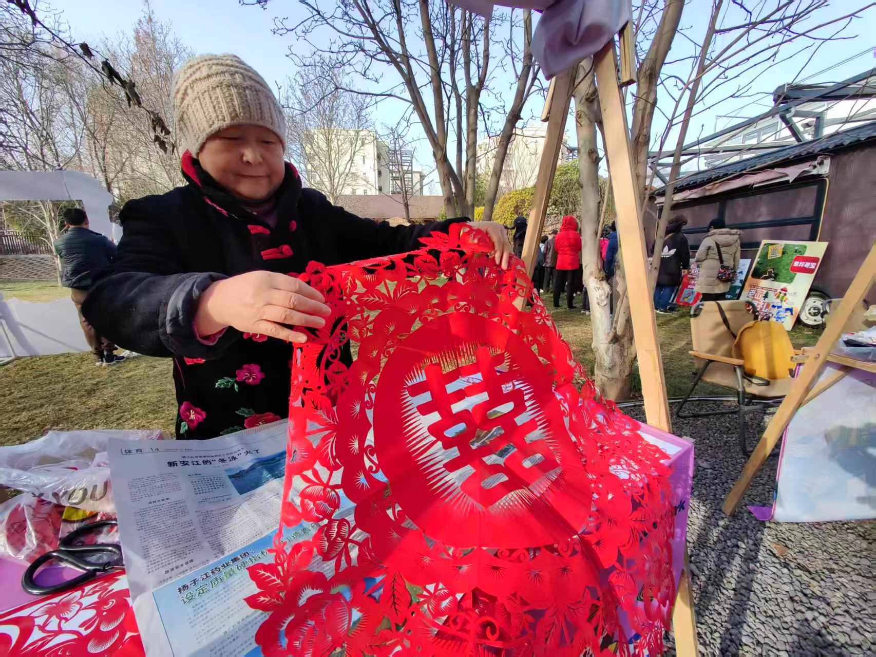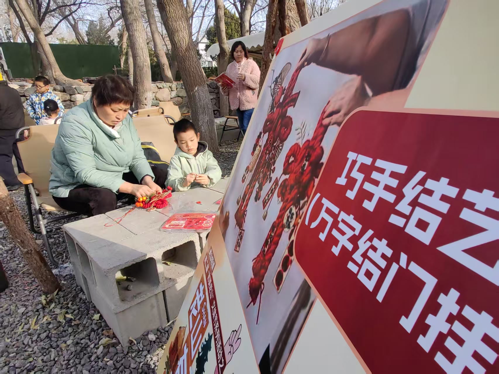 △相邻的“万字结门挂”区域,大家以红果、银杏、福牌等元素,编织出寓意“丰收”与“吉祥”的创意门挂。