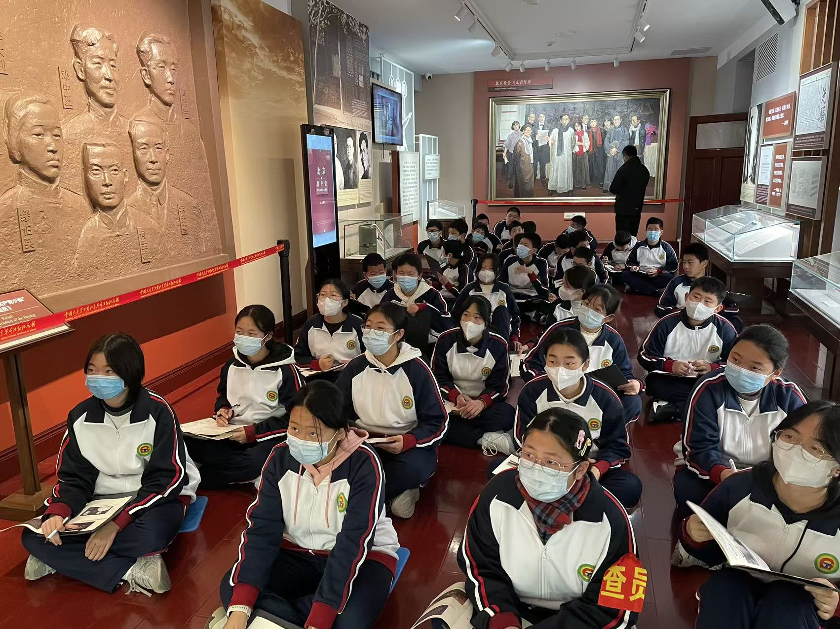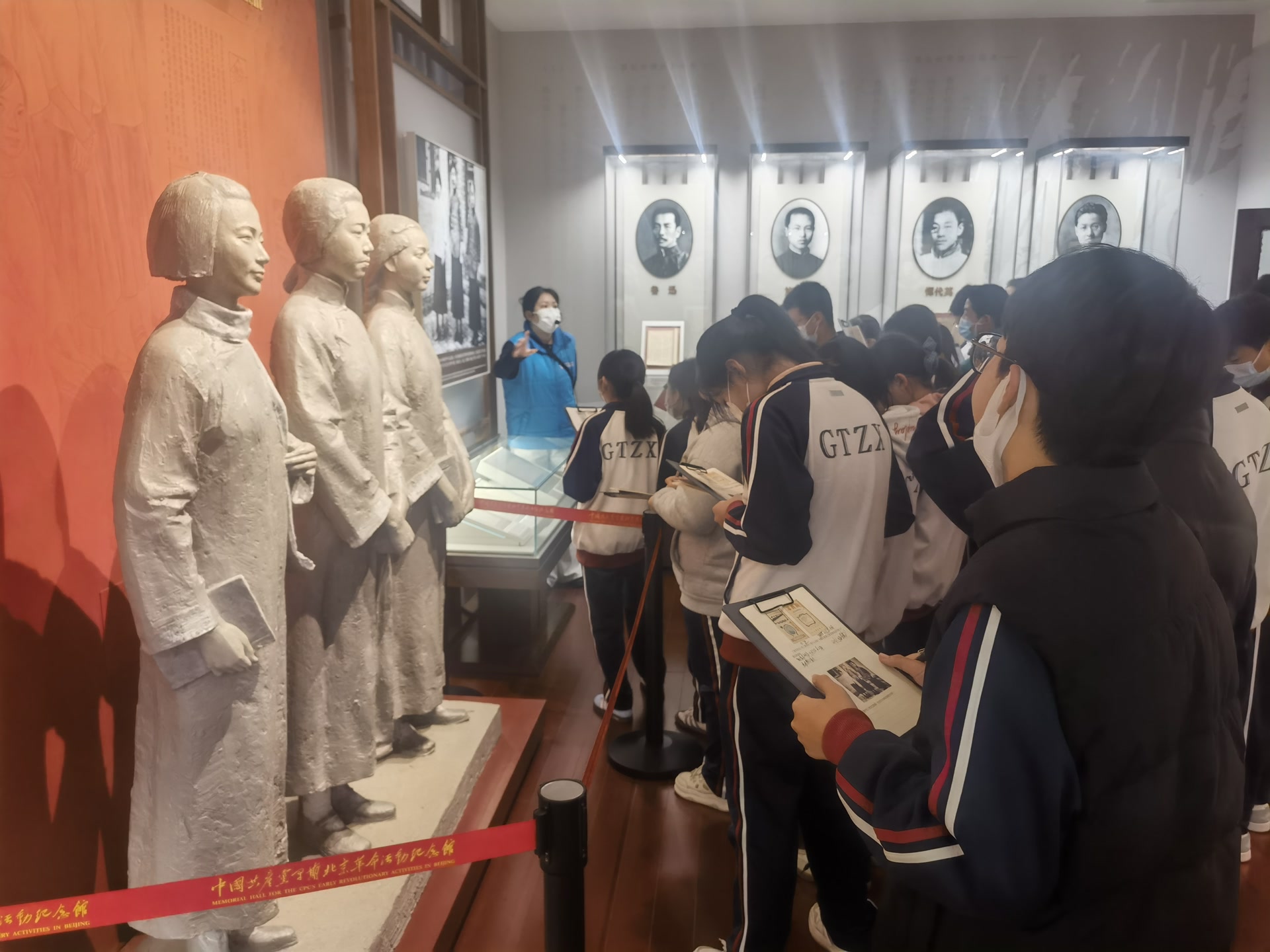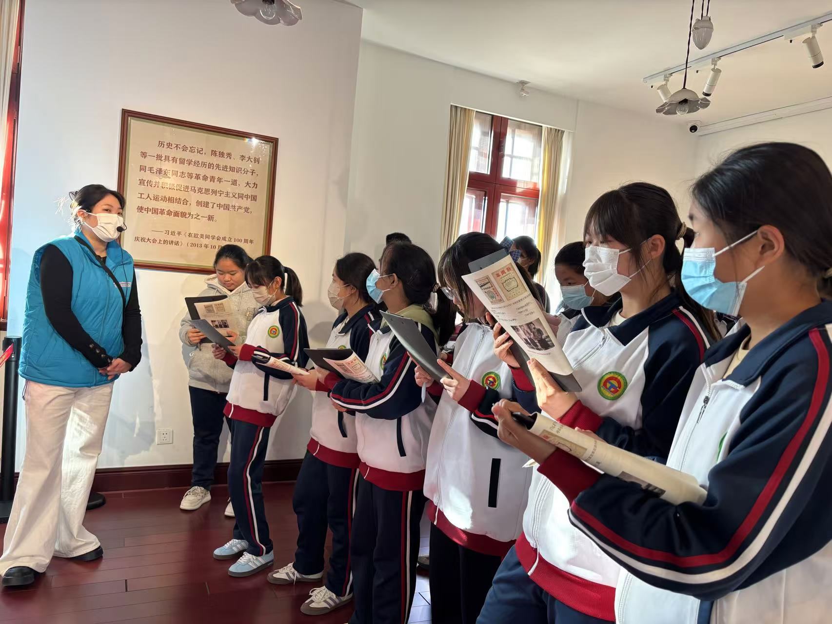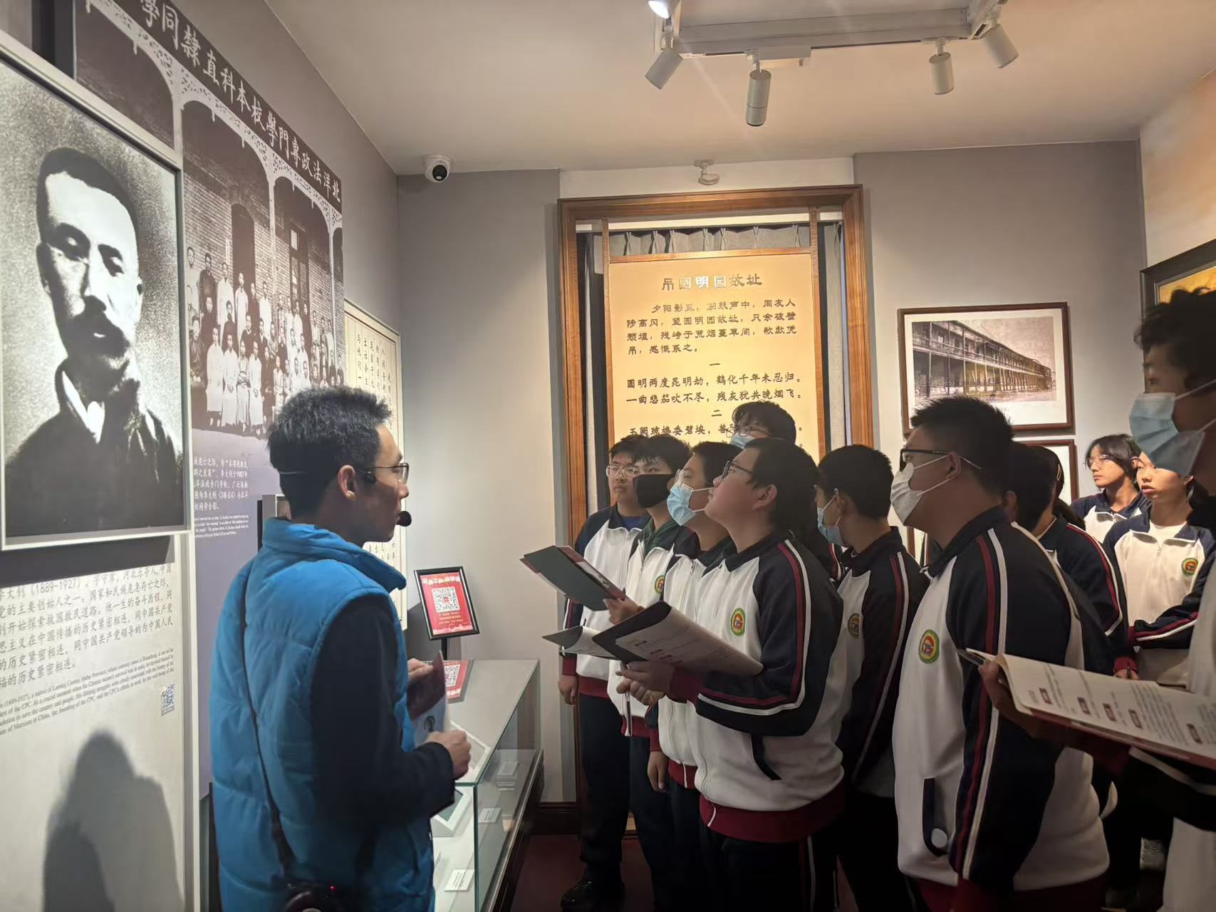 步入北大红楼,木质楼梯的咯吱声仿佛穿越时空的对话。在讲解员的引领下,同学们有序参观了《新青年》编辑部旧址、李大钊工作过的办公室等复原历史场景。泛黄的手稿、珍贵的照片、复原的旧物前,大家驻足凝视、认真记录,时而低声交流感悟。当听到有关李大钊先生“铁肩担道义,妙手著文章”对联相关故事时,同学们深刻体会到先辈们为救国救民不懈探索的赤诚之心,红色文化的种子在心中悄然扎根。