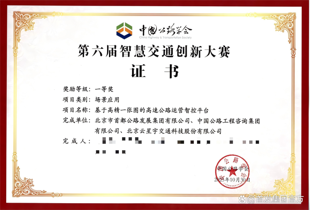 近日,由中国公路学会主办的“第六届智慧交通创新大赛”决赛在深圳圆满落幕。由北京市首都公路发展集团有限公司、中国公路工程咨询集团有限公司、北京云星宇交通科技股份有限公司联合打造的“基于高精一张图的高速公路运营智控平台”项目,在46个决赛优秀作品中脱颖而出,荣获场景应用类一等奖。