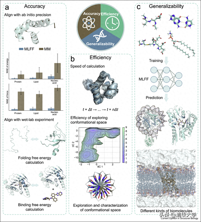 近年来,人工智能的兴起,如AlphaFold在蛋白质结构预测领域的突破,凸显了人工智能在计算结构生物学中的潜力。基于MLFF分子动力学模拟使用神经网络计算原子的受力并迭代更新位置和速度,能够追踪分子行为的时序演化,从而探查生物分子的复杂机制。