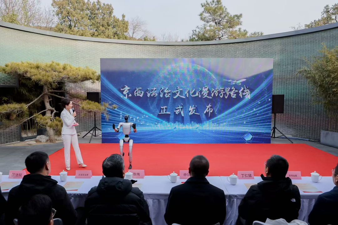 机器人“小法”带领现场观众开启一场京西特色法治路线的“云端漫游”,由此,“京西法治文化漫步路线”小程序正式发布上线。该款小程序集法治教育、文化体验、互动打卡等功能于一体,涵盖老山东里北法治公园、业余大学法治教育基地、首钢园、八大处等18处点位,将全区法治文化阵地与文旅热点有机结合,以科技赋能、以文化润心,让普法由“被动接受”向“主动体验”、由“理论说教”向“场景感知”转变。