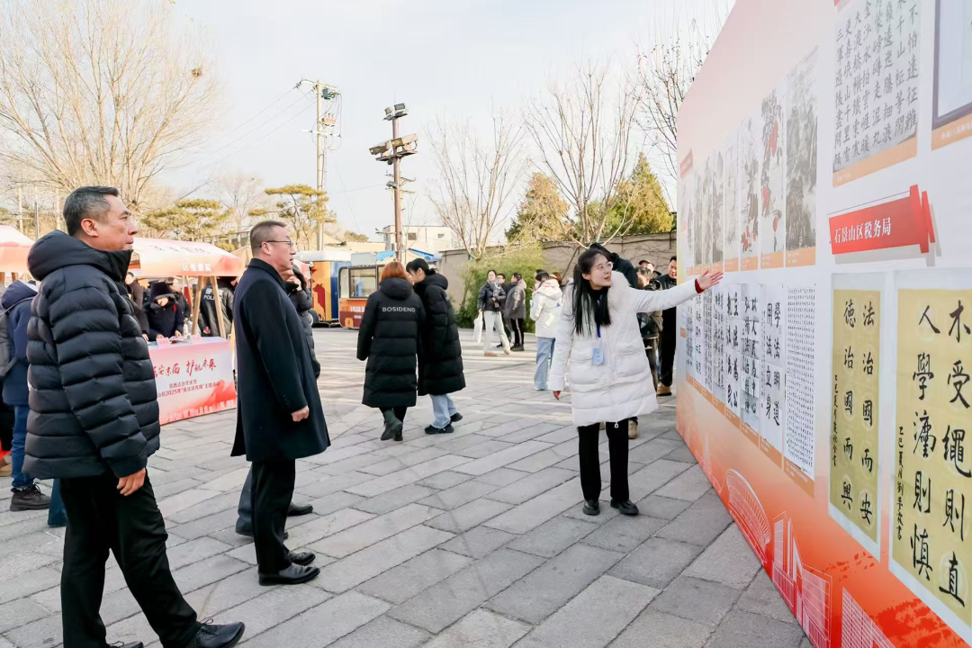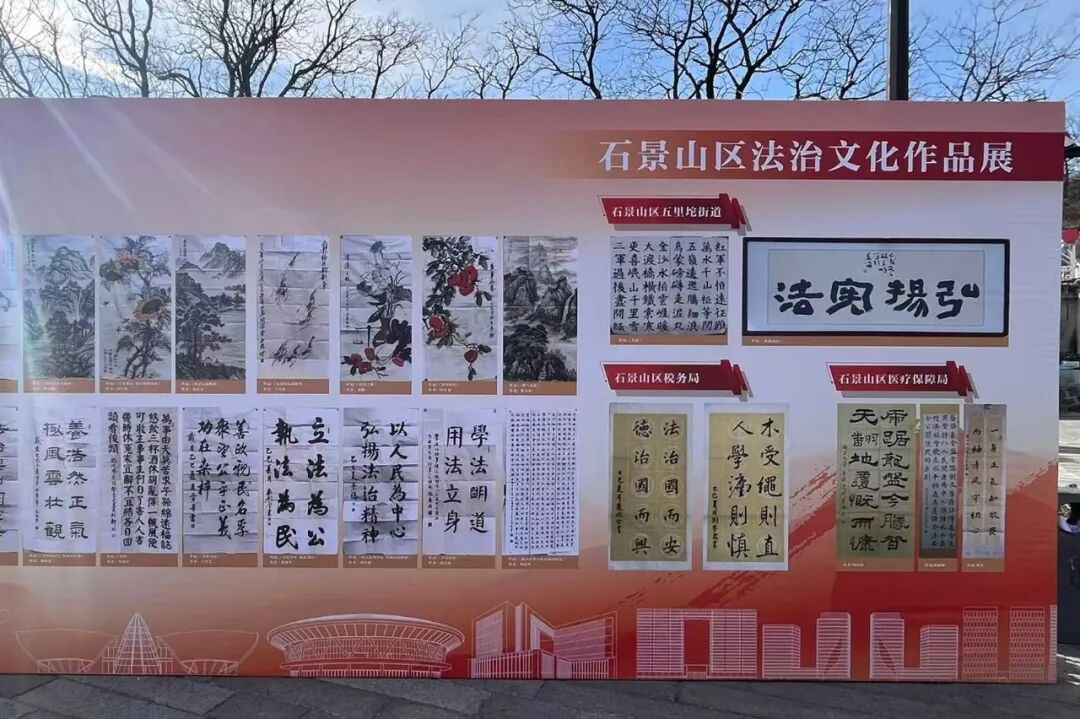 主会场外,模式口公园人头攒动、“法味”十足。本次活动设置有“法治文化作品展览”和“普法责任制单位展台”两大室外环节,以大型展板形式,展出区委老干部局、区教委、公安分局等多家单位的41幅优秀法治文化作品,涵盖书法、绘画、剪纸、海报等多种形式,生动展现出全区法治文化建设的昂扬面貌与丰硕成果,引来大批居民、游客驻足欣赏。