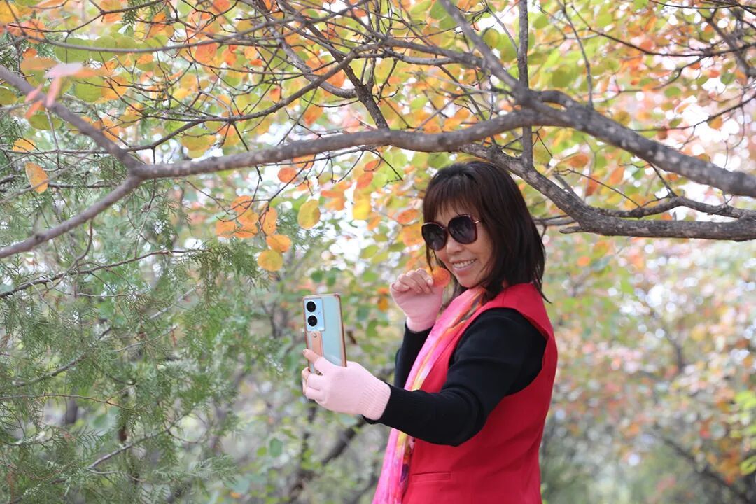 今年红叶季,舞彩浅山的树木披上了红、橙、金、青的盛装,色彩斑斓、美不胜收。阳光透过红叶的缝隙洒下,为蜿蜒的山路铺上斑驳的光影。漫步在舞彩浅山登山步道,仿佛置身于一幅巨大的油画之中。游客或全家出游,或与朋友结伴而行,在如画风景中拍照打卡,尽享惬意时光。