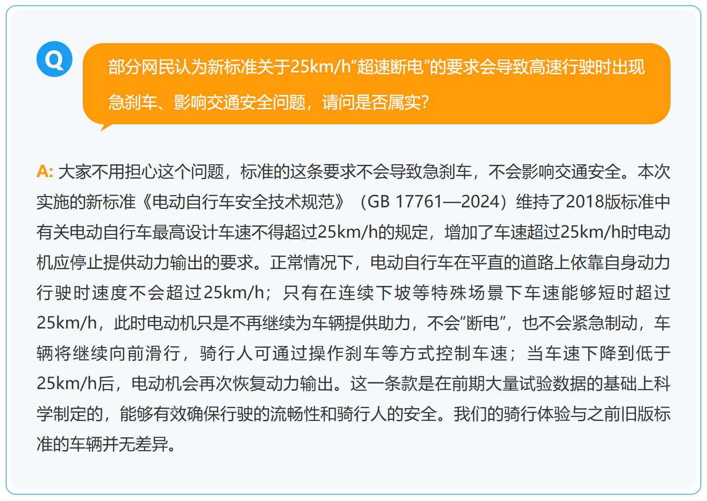 2025年12月1日,新修订的强制性国家标准《电动自行车安全技术规范》(GB 17761—2024)实施过渡期正式结束,符合新标准的电动自行车陆续投放市场。近日,部分网民对标准的相关内容提出了疑问。为主动回应公众关切,中国电子技术标准化研究院作为该标准的主要起草单位,就有关问题解答如下。