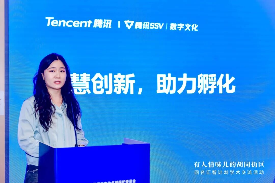腾讯SSV产品运营经理谢佳妍则从科技赋能角度,阐述“智慧创新,助力孵化”主题。她介绍,腾讯SSV运用AI、大数据技术参与“四名汇智”计划,开发了胡同保护数字平台,实现街区人流监测与遗产数字化建档。“科技不是冷工具,而是连接人与历史的桥梁——例如,‘AI绘白塔’工作坊就让亲子家庭在互动中爱上名城保护。”谢佳妍补充道,腾讯SSV未来将深化合作,推动胡同保护智能化升级。