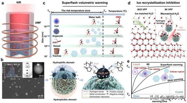 针对这一问题,清华大学深圳国际研究生院耿洪亚助理教授团队在前期研究抗冻多肽和抑冰-光热纳米冻存剂的基础上,设计了一种具有雪人状结构的Janus纳米杂化材料(VPF),从“抑冰-升温”两条主线同步展开,通过结构设计、界面调控与能量耦合策略,实现了在微观与宏观尺度上均极具突破性的抑冰与超快均匀复温能力(图1)。