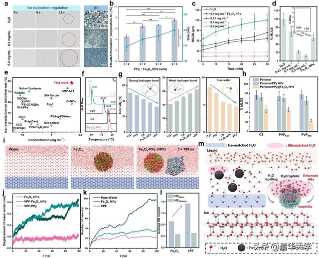研究中构筑的Janus材料由磁性Fe₃O₄NPs与光热PPy不对称组合而成,形成一个类似雪人的头部-躯体结构。这一结构在冰-水界面表现出极强的“水化-去匹配”双调控效应:Fe₃O₄NPs通过强水合作用破坏局部氢键网络,削弱自由水分子与冰界面的匹配;PPy与冰晶表面贴合形成微曲界面,通过Gibbs-Thomson效应抑制重结晶,并驱动水分子由冰界面转移至亲水“头部”。分子动力学模拟进一步揭示了这种Janus构型在冰-水界面的协同抑冰机制,使冰晶平均面积减少高达98.4%(图2)。