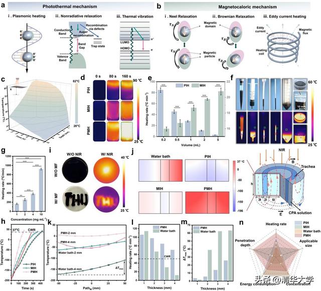 在升温方面,该材料基于光热-磁热协同原理,能够在交变磁场(AMF)和近红外光(NIR)作用下产生动态旋转,使热量得以在各方向迅速、均匀扩散。与传统外水浴加热方式不同,VPF在组织内部实现“热源自内而外”的体相加热模式,从根本上消除温度梯度与热应力问题,使大尺度组织得以安全通过最危险的结冰温度区间(图3)。该方法实现了超过920 ℃/min的超快升温速率,并可穿透数厘米厚组织,为器官级冻存提供了此前难以实现的复温条件。