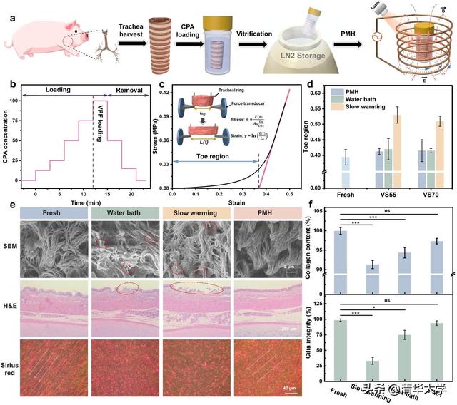 依托这一抑冰-升温双机制,人脐静脉内皮细胞、MSC、神经细胞等多种细胞类型均保持高活性与功能;益生菌在无DMSO情况下仍保有近86%活性;神经细胞球在低浓度冷冻保护剂(CPA)条件下完整保留了3D结构、线粒体功能与后续神经分化潜能;在复杂度更高的50mL级猪气管样本中,组织纤毛、胶原分布及力学特性均与新鲜组织高度一致,显示出对器官尺度的良好适配性(图4)。更为关键的是,VPF具备优异的磁响应特性,可在升温后实现超过98%的快速分离,极大降低了操作难度,便于未来GMP转化。