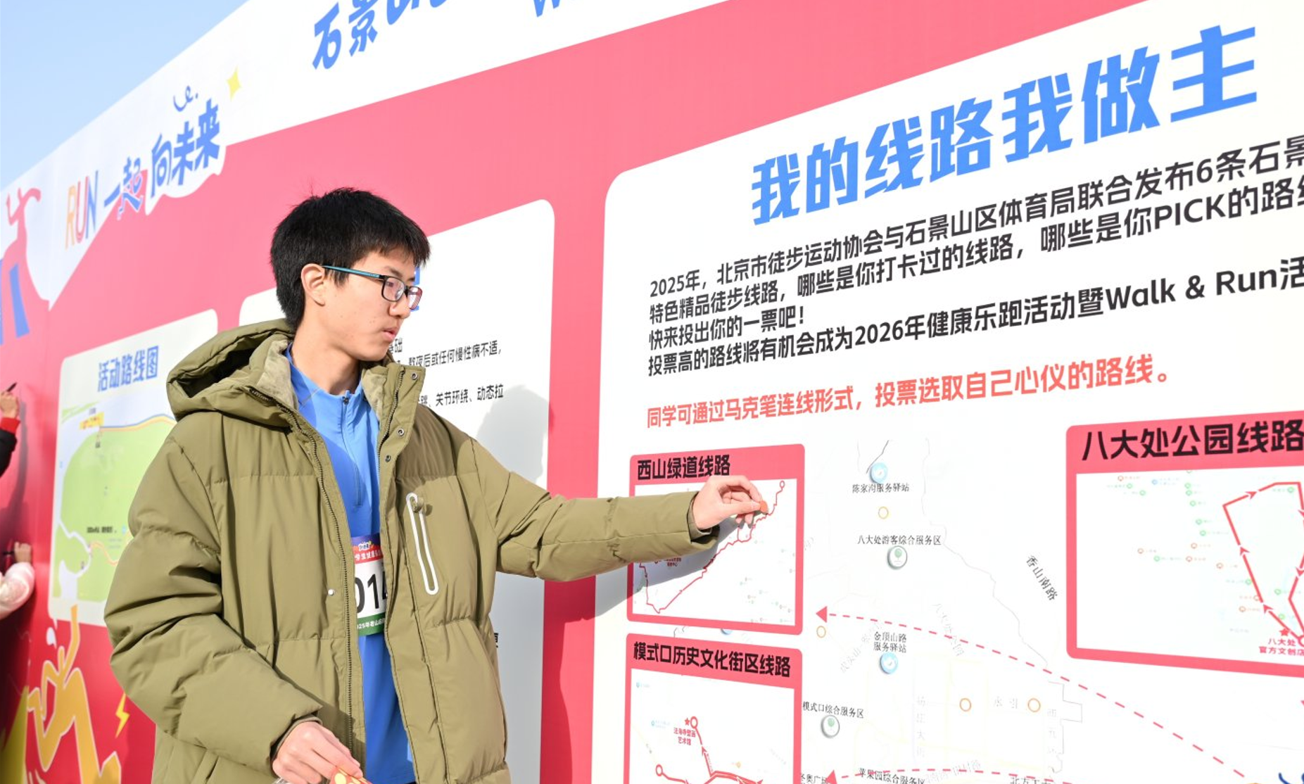 在活动主广场区域,设有北京市徒步运动协会和石景山区体育局联合发布的石景山区特色精品徒步路线图和安全小贴士,将健康理念自然渗透于赛事场景。学生可通过马克笔连线的趣味方式参与路线投票,选取他们最PICK的路线,既激发了学生的主人翁意识,又为后续活动优化提供了重要参考。此外,各学校后续将开展系列校级活动,利用大课间、课后服务等时间,举行主题跑、亲子跑、迷你马拉松等跑步活动。