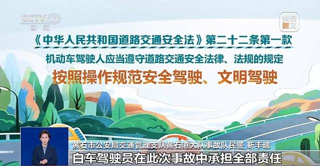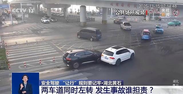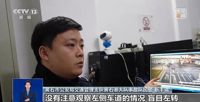 黄石市公安局交通管理支队黄石港大队事故队民警 靳丰瑞:本起事故中,右侧车道的白车在转弯时,没有注意观察左侧车道的情况,盲目左转,也未与左侧的车辆保持足够的横向安全距离,是此时事故发生的全部原因。根据《中华人民共和国道路交通安全法》第二十二条第一款的规定,我们认定,白车驾驶员在此次事故中承担全部责任。如果换一种情况,这辆黑车如果是在左转弯的时候,没有及时左转,而是一直往前开,没有与右侧车辆保持足够的横向安全距离,没有给右侧车辆留出足够转弯空间的情况下,内侧车道的车辆也是要承担相应责任的。