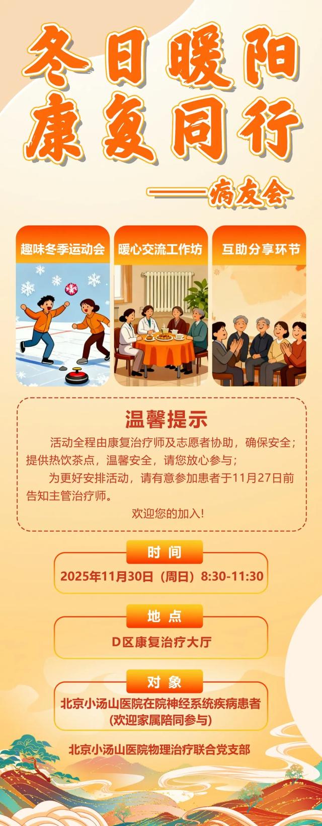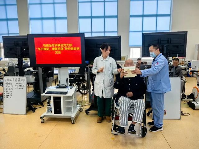 冬日清晨,阳光透过玻璃窗,洒在小汤山医院的治疗大厅里。这里没有往日的器械声响,却洋溢着阵阵欢笑。2025年11月30日,由物理治疗临床联合党支部为在院神经系统疾病患者精心筹办的神经康复病友会——“冬日暖阳,康复相伴”,在D区康复治疗大厅拉开序幕。