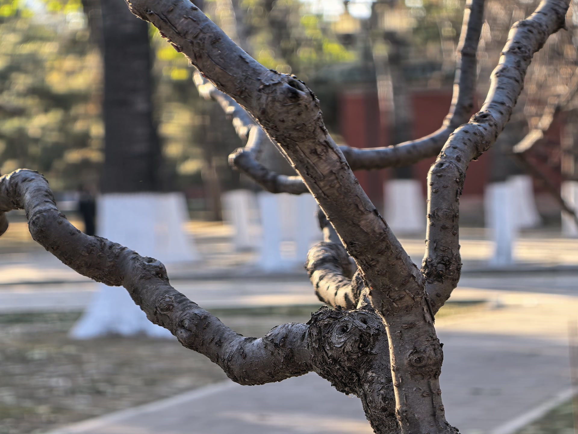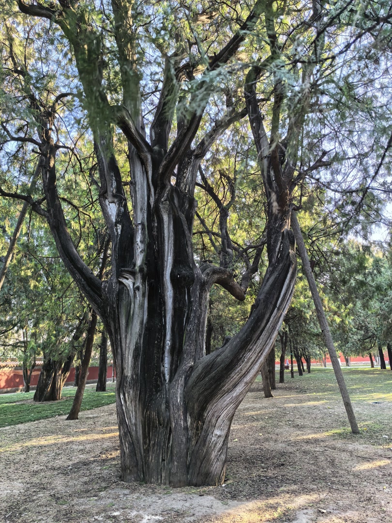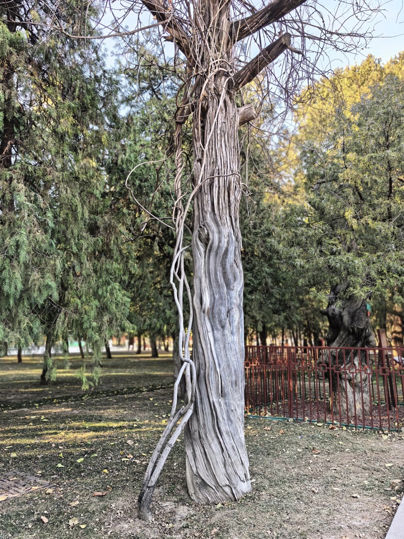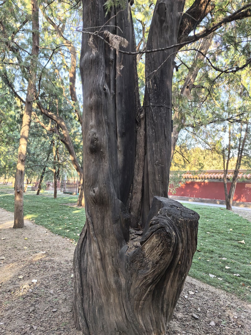 也是这样一个晴好的冬日,怕也是十二月吧。那时我不过七八岁的光景,弟弟妹妹更小。姥姥领着我们来地坛。那时的公园,似乎比现在更“野”一些,墙垣也更斑驳,游人更是稀少。我们像出了笼的雀儿,在空旷的园子里疯跑。不知是谁先提议捉迷藏,我便一眼相中了这棵“肚子里能装人”的大树。趁他们背过身去数数,我便手脚并用地,从那洞口爬了进去。里面比我想象的要宽敞,像一个小小的、秘密的巢穴。光线从洞口和上方的一些裂隙漏进来,形成几道朦胧的光柱,光柱里有无数的微尘在欢快地舞蹈。外面,弟弟妹妹清脆的喊声由远及近,又由近及远:“找到你啦!”“哈哈,在这儿呢!”……他们的脚步“咚咚”地跑过草地,有时甚至就停在离树洞不远的地方,我能听见他们急促的呼吸声。我紧紧地捂住自己的嘴,连心跳都憋得轻了,那股混合着兴奋与紧张的快意,像小虫子一样,在心里酥酥地爬着。