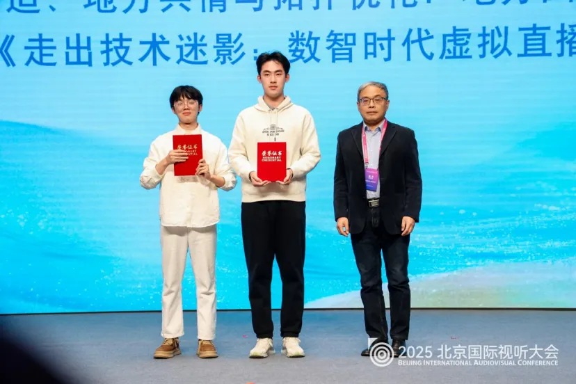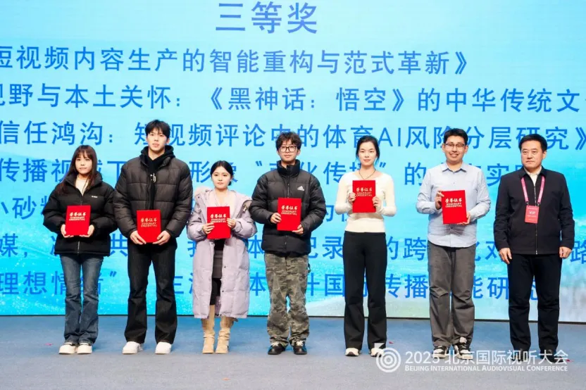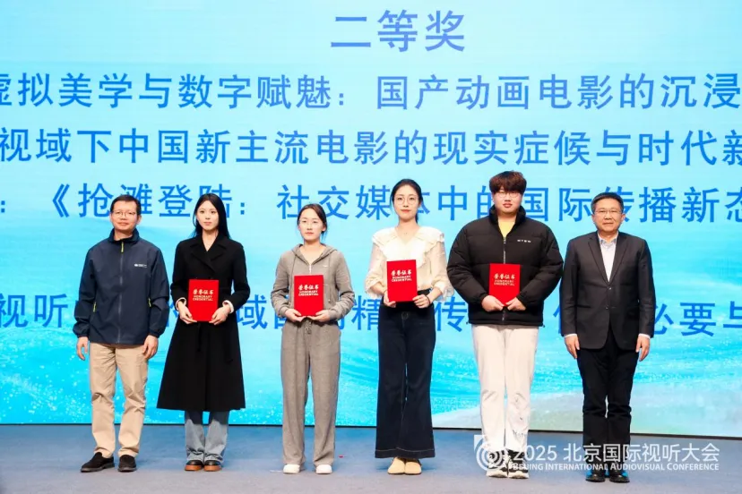 最后,本次论坛还公布了第二届“视听全球 传播未来”论文获奖名单,一等奖2人、二等奖4人、三等奖6人,由北京语言大学国际政治与传播学院党委书记谢刚、中国人民大学新闻学院院长周勇、西安交通大学新闻与新媒体学院院长汪文斌、北京体育大学新闻与传播学院院长李岭涛分别为其颁发证书。
