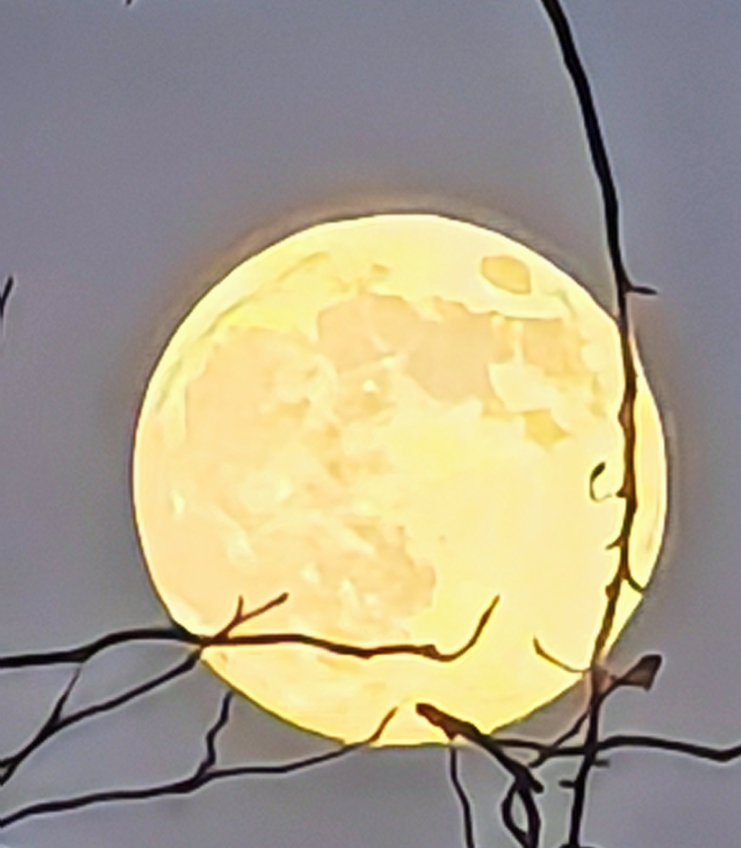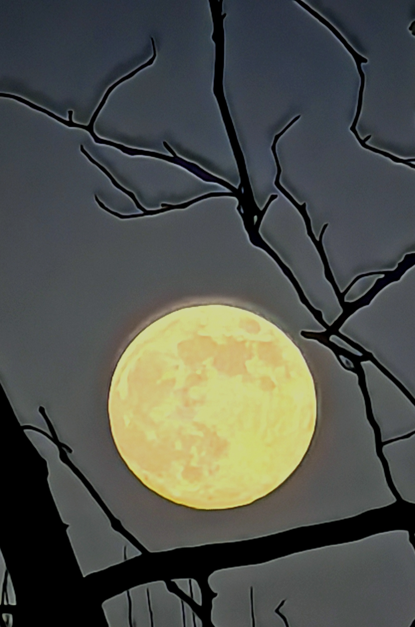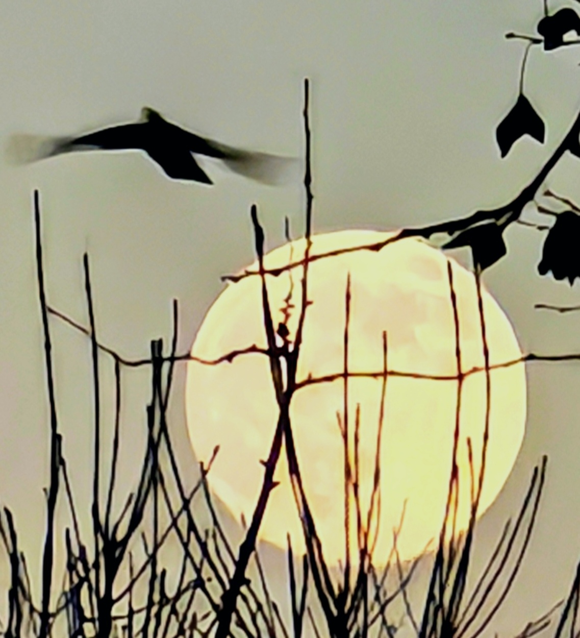2025年12月4日傍晚,北京市朝阳区,一只飞鸟向着“超级月亮”振翅飞翔,妙趣横生。