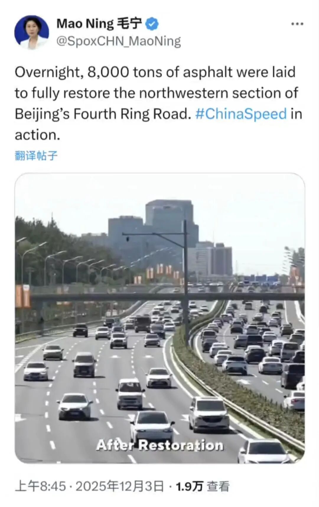 近日,外交部新闻发言人毛宁通过海外社交平台,分享了一段以“中国速度”为主题的视频,向世界展示了北京四环路大修及环境提升工程的卓越成果。这不仅是基础设施的物理更新,更是一次中国在超大城市治理中系统效能、组织协调与技术创新速度的集中展现。