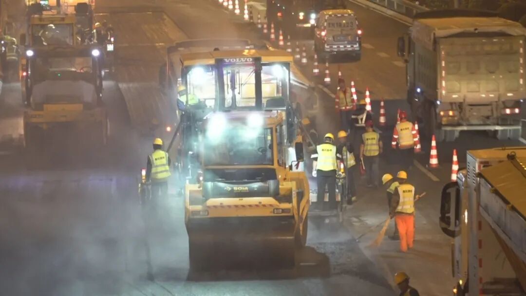 为保障日均车流量巨大的城市主动脉“不停运”,工程选择了最高难度的模式:每日23点至次日5点,在有限的6小时内,多个作业面同步展开,完成旧路铣刨、新料摊铺、精细顺接等全套工序。施工团队以毫米级的精度控制坡度与衔接,确保黎明时分道路准时、平整开放。这种“把麻烦留给自己,把畅通留给市民”的“微创手术”,攻克了超大城市主干线“不停运维修”的世界性难题,展现了中国基建在极限条件下的精细作业与高效履约速度。