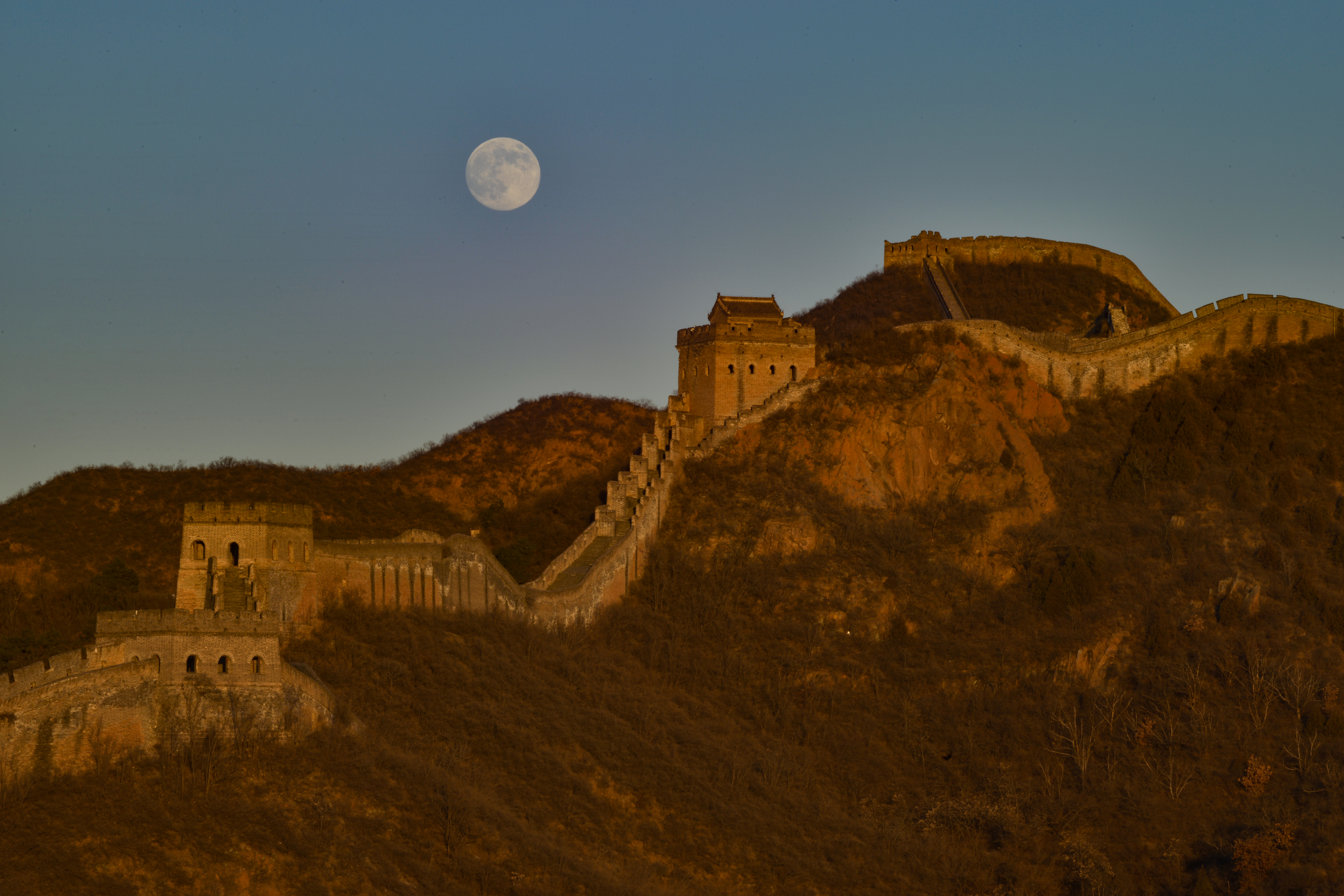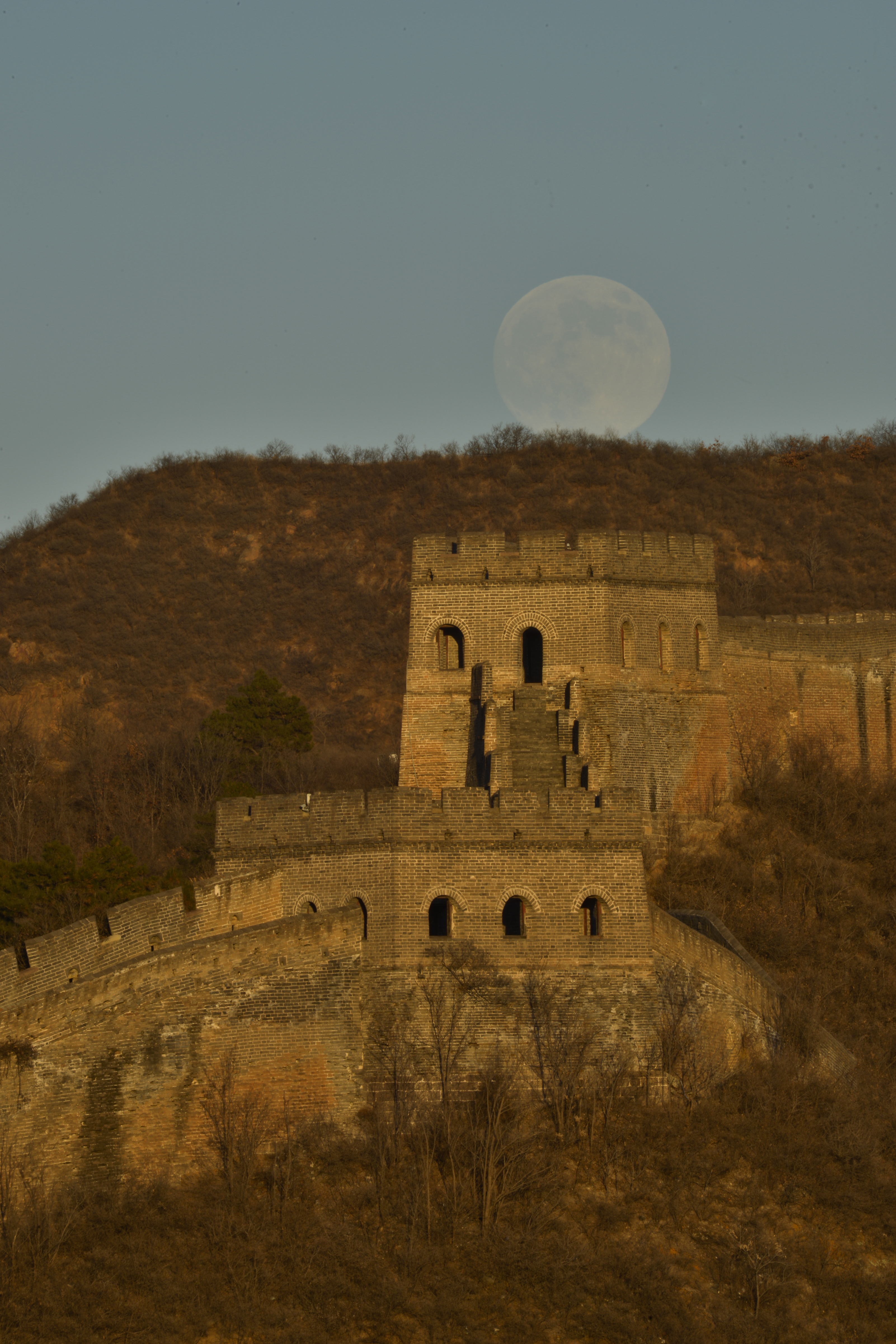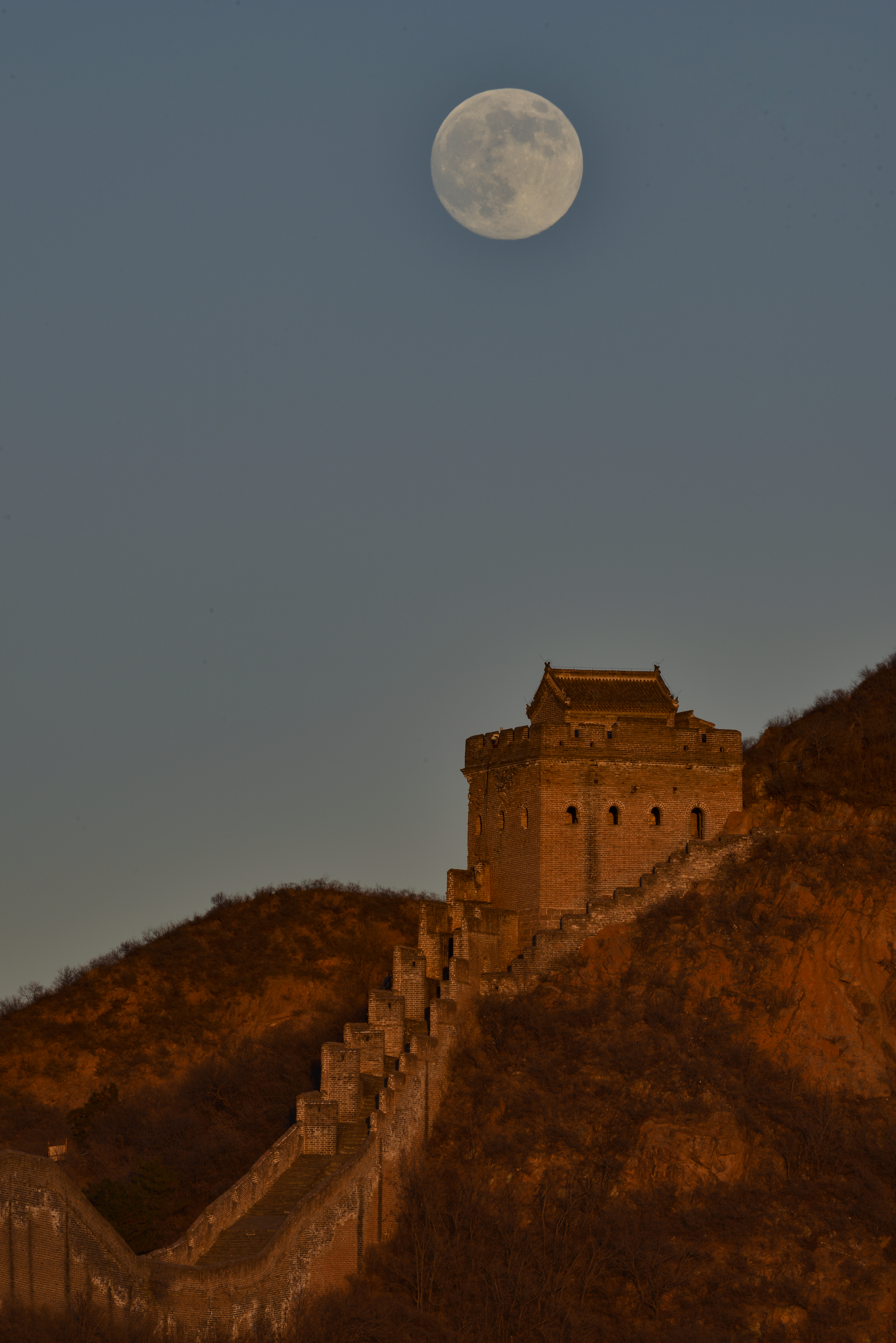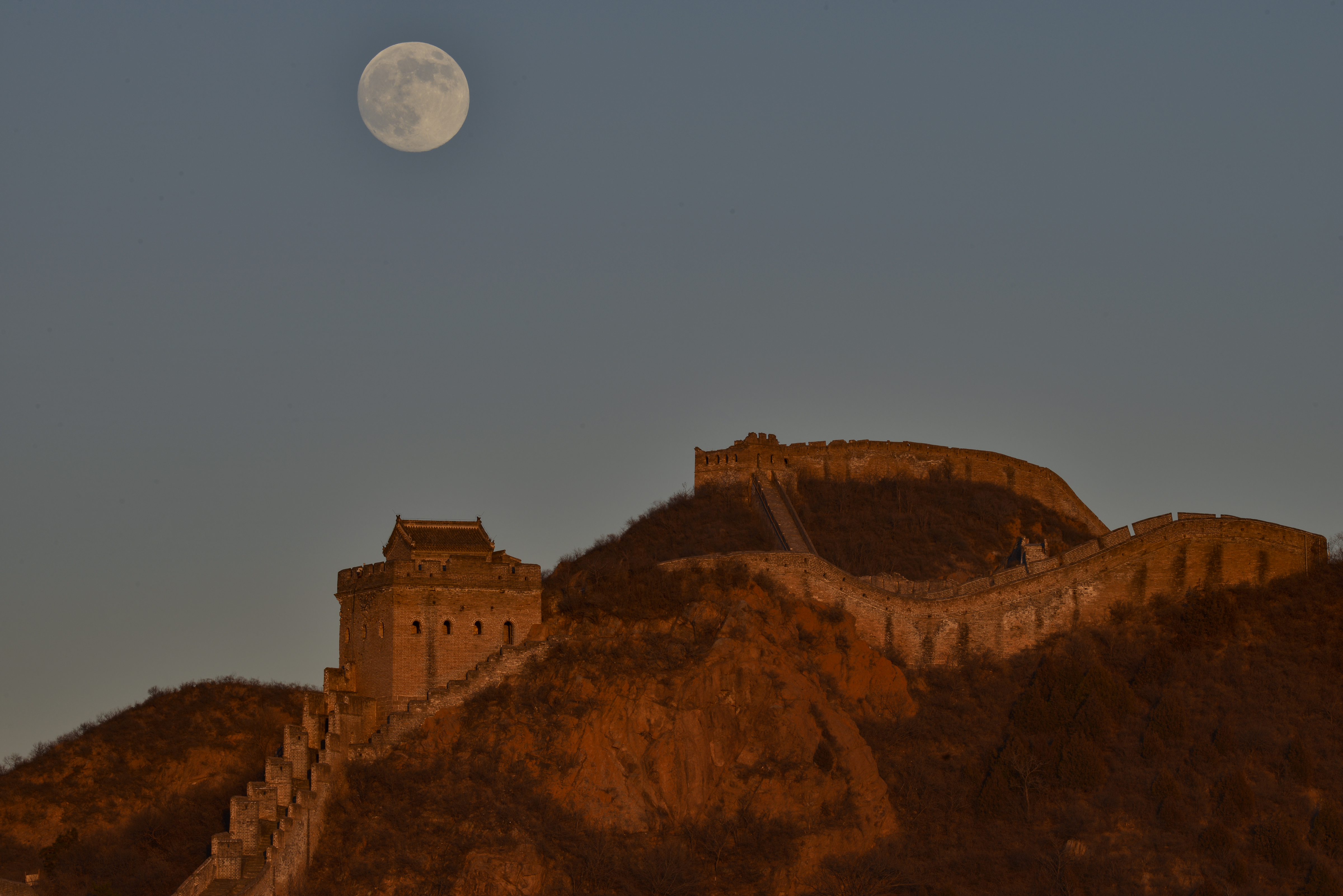 2025年12月4日,傍晚时分,年度第二大满月亮相天宇。河北省承德市滦平县的金山岭长城,天气晴好,碧空如洗,“超级月亮”如约而至,皓月当空与古长城遥相辉映,美轮美奂,宛若壮美画卷。