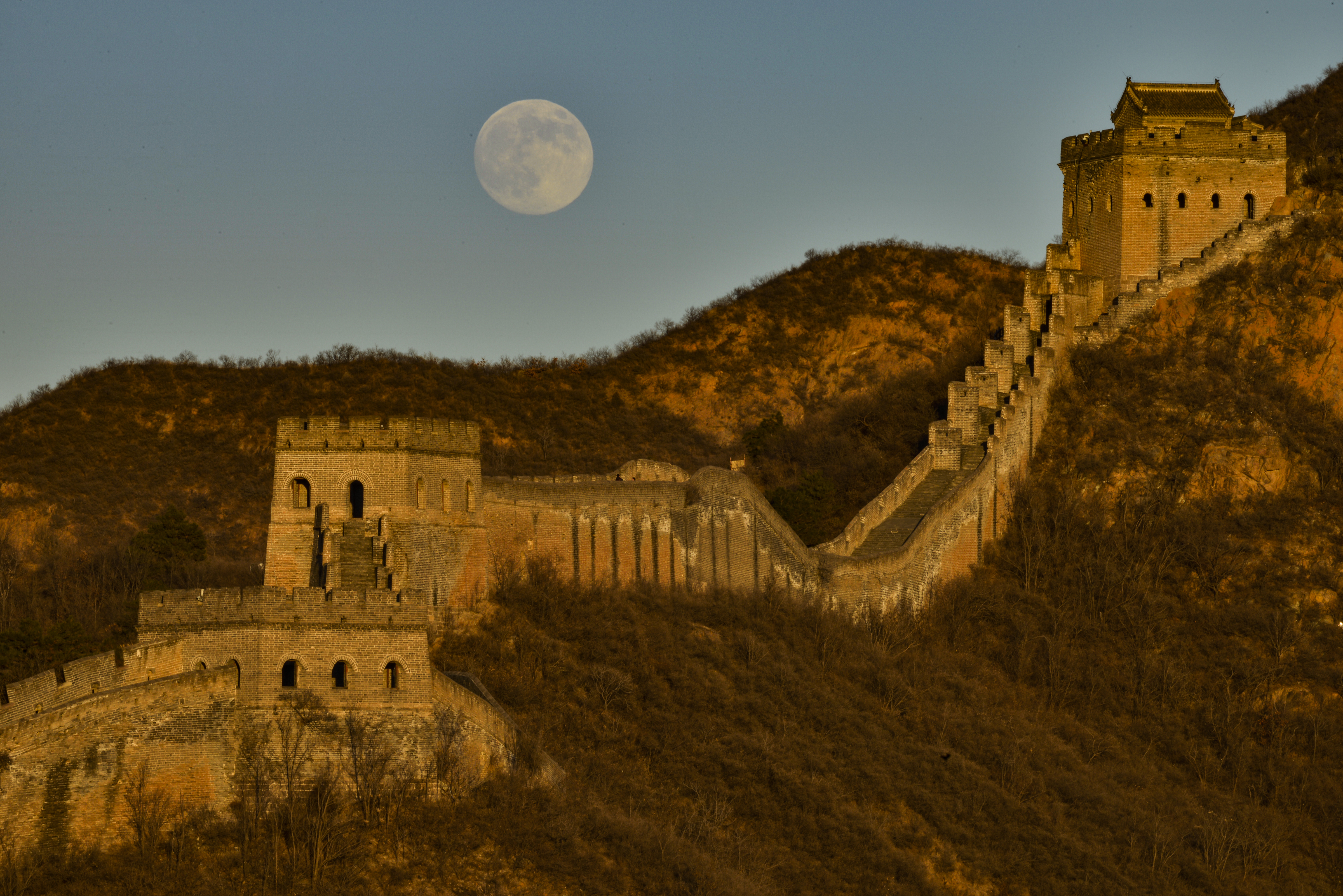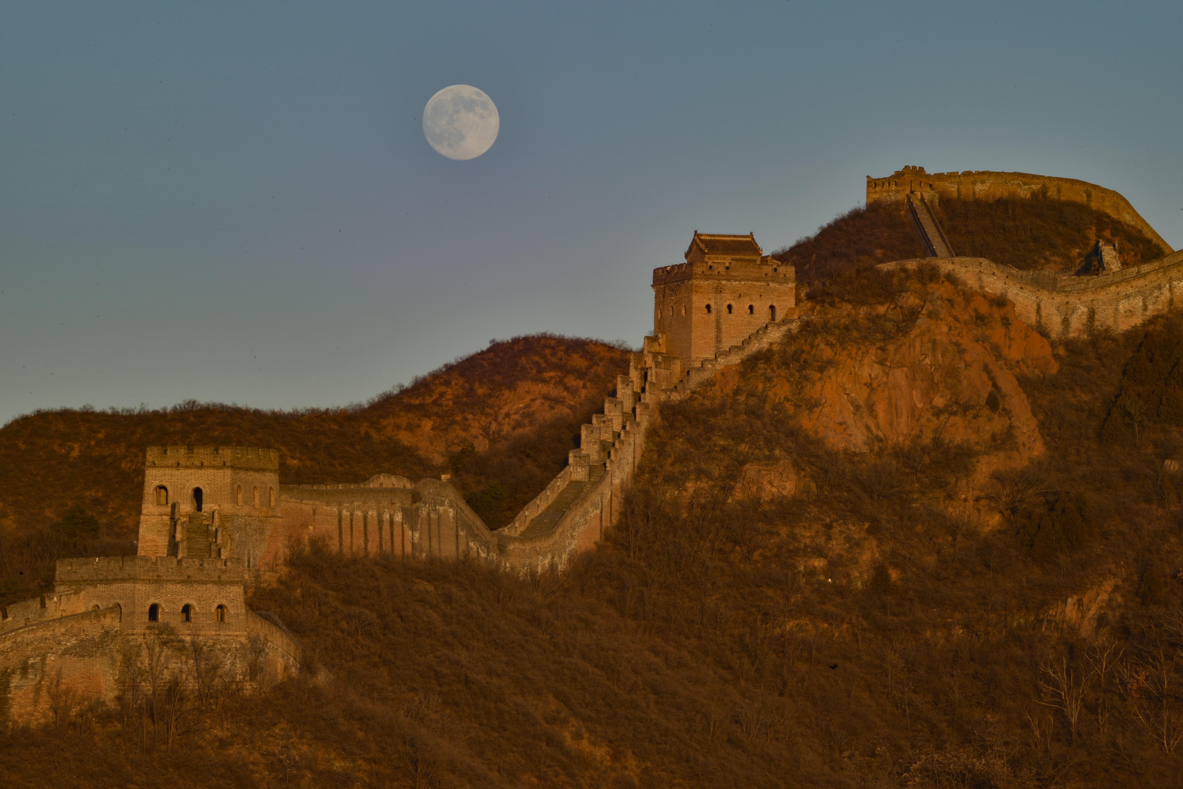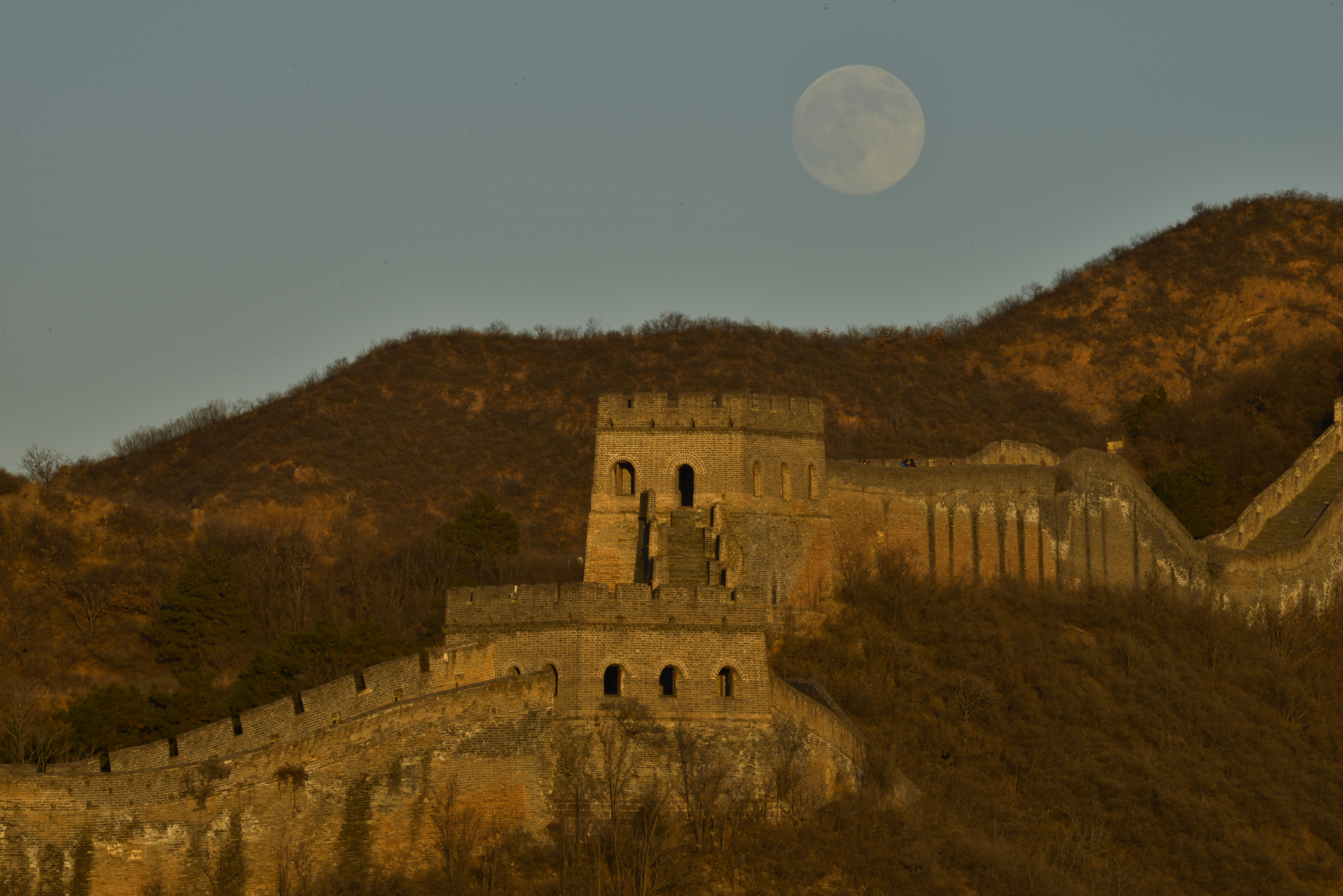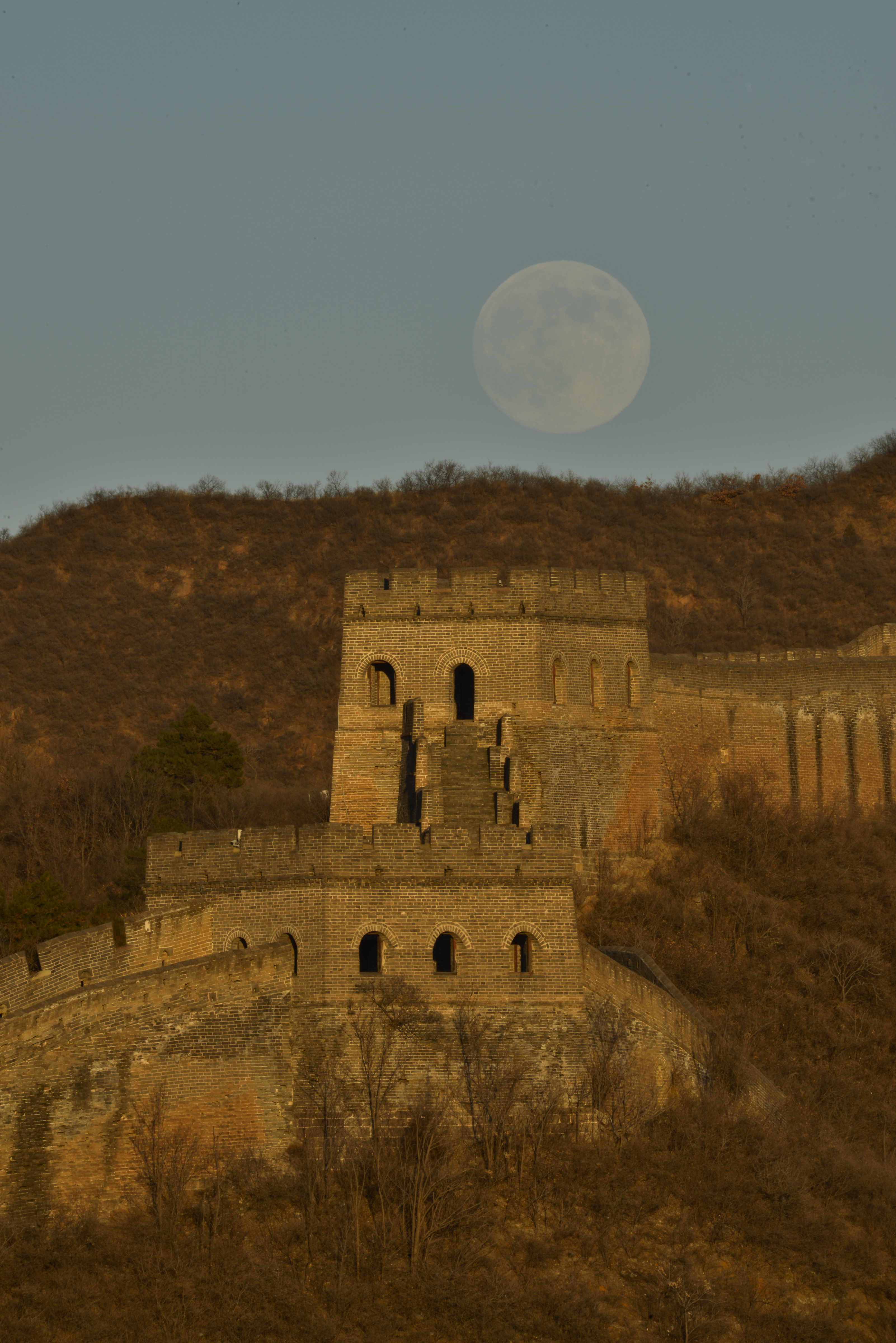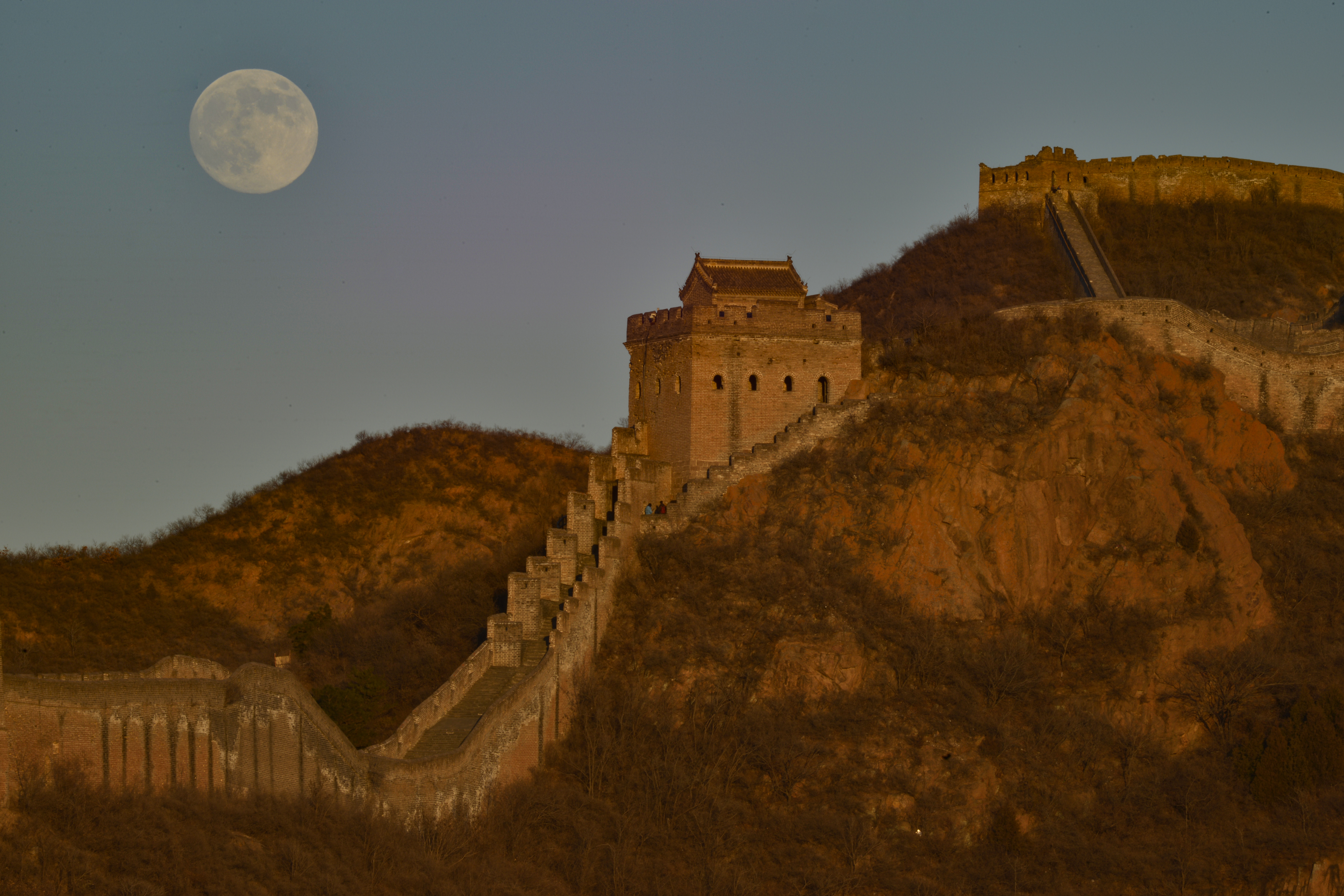 2025年12月4日,傍晚时分,年度第二大满月亮相天宇。河北省承德市滦平县的金山岭长城,天气晴好,碧空如洗,“超级月亮”如约而至,皓月当空与古长城遥相辉映,美轮美奂,宛若壮美画卷。