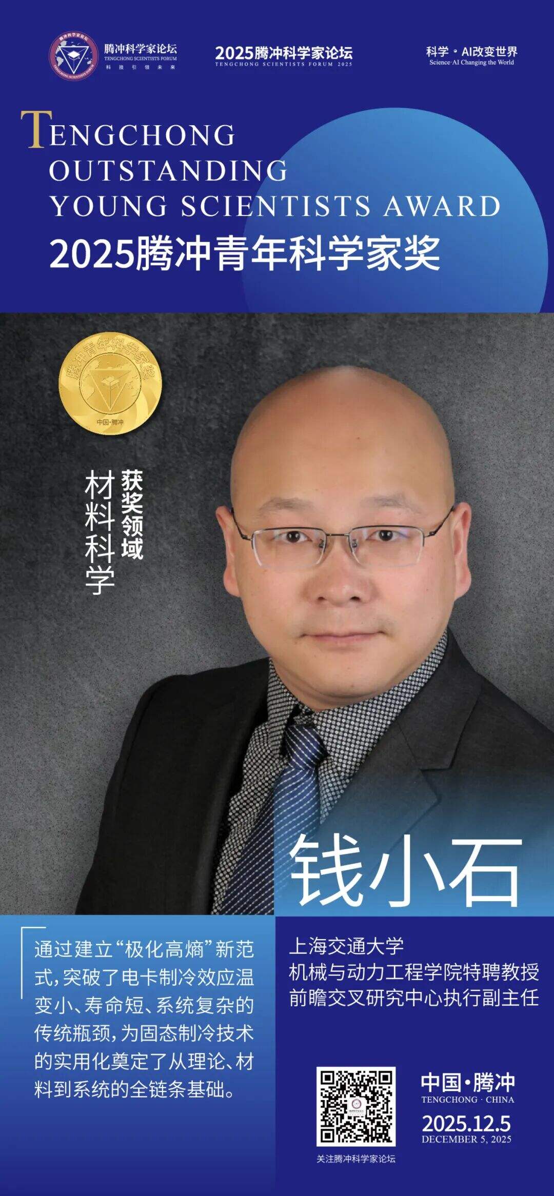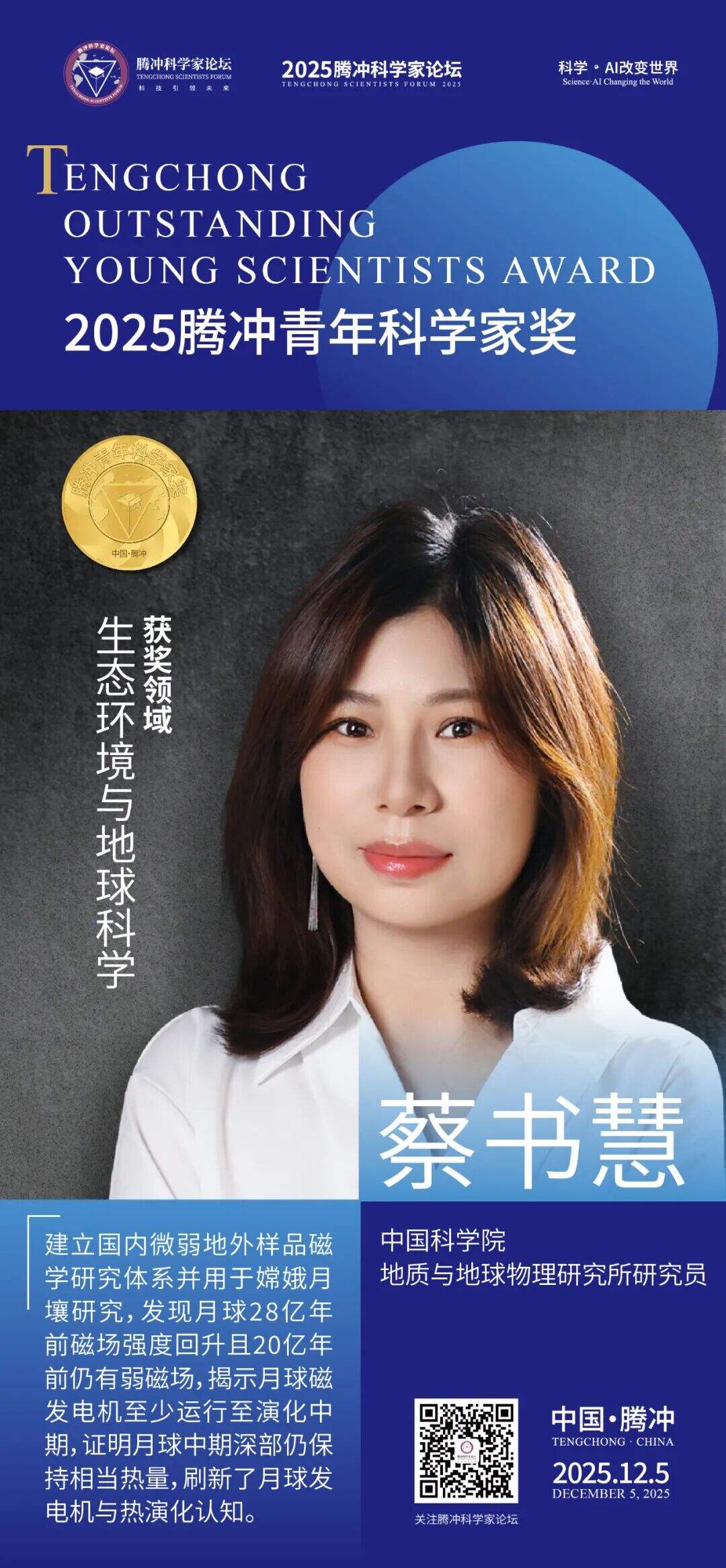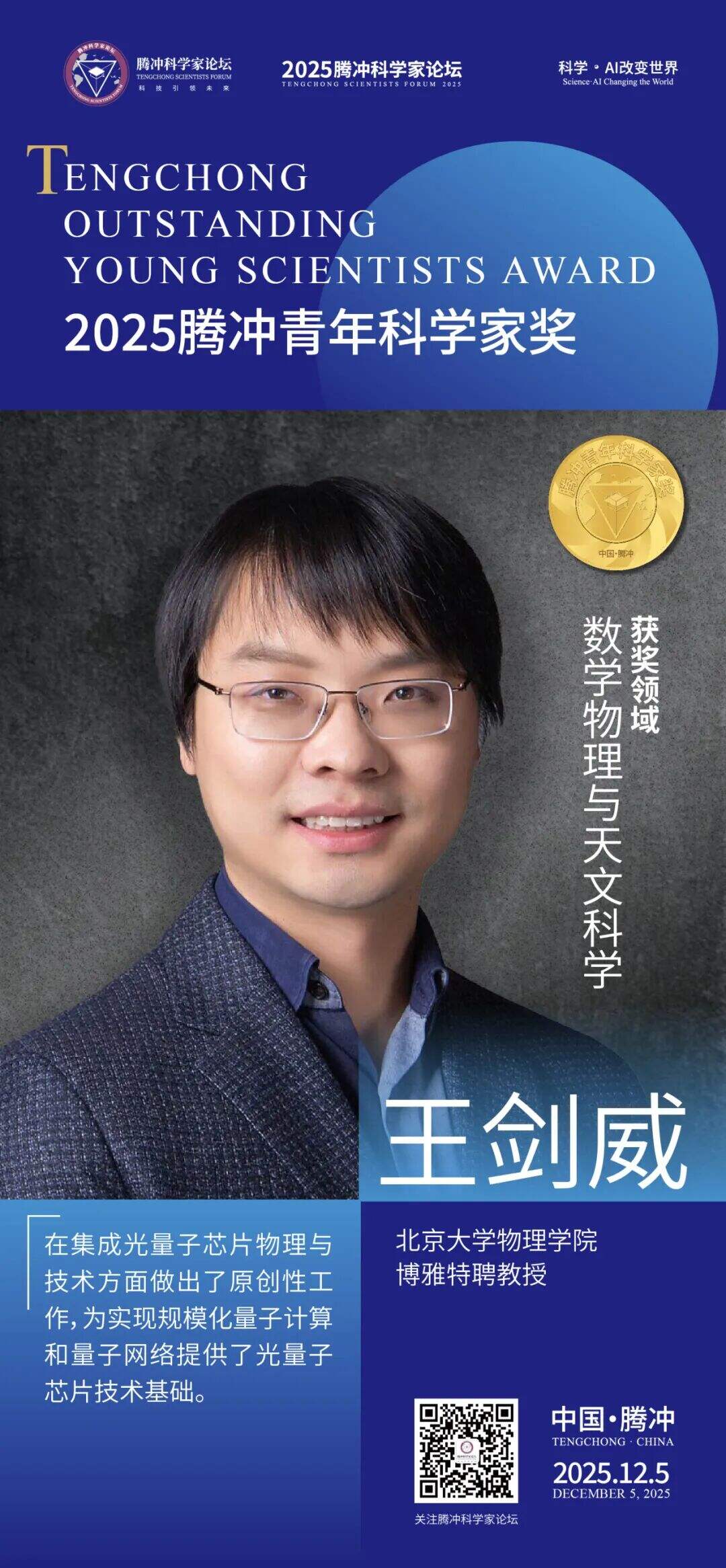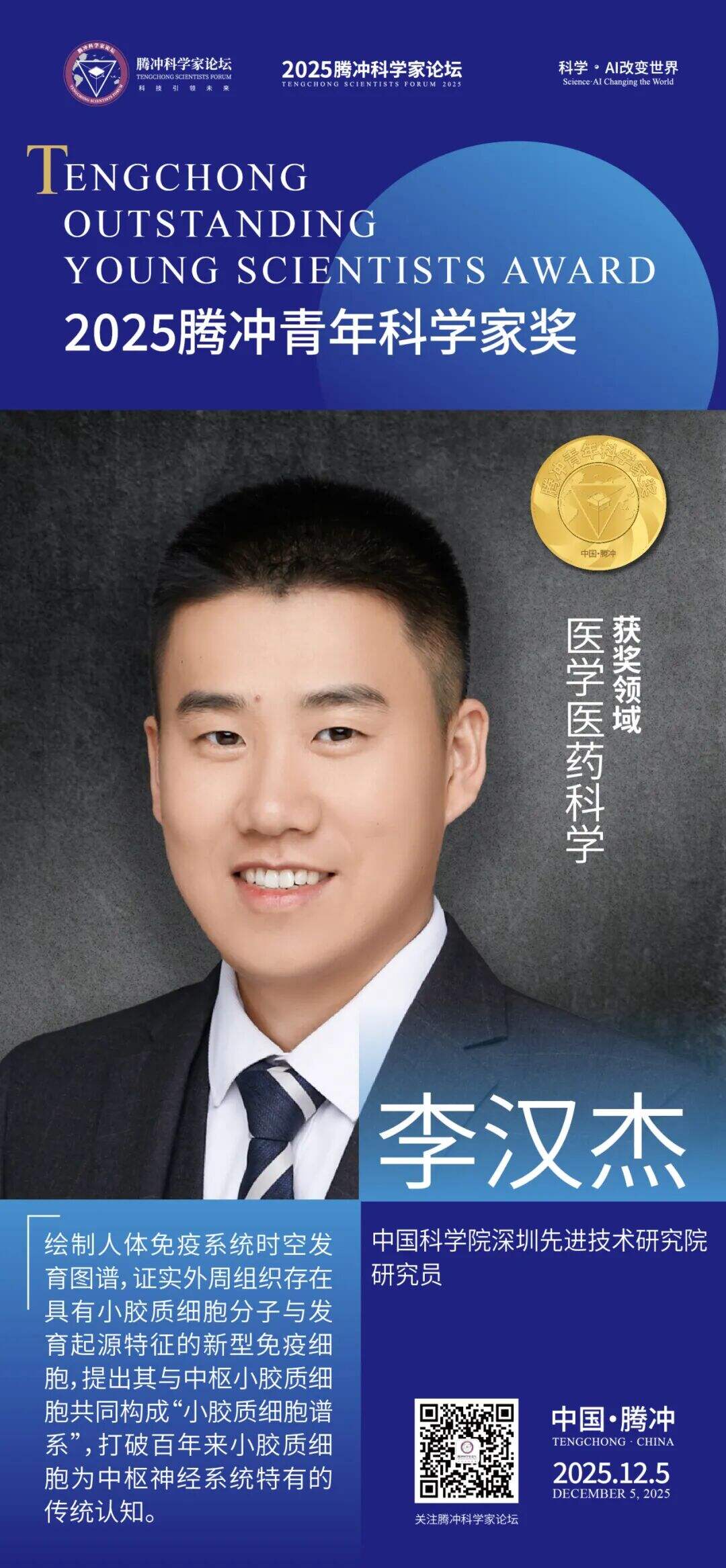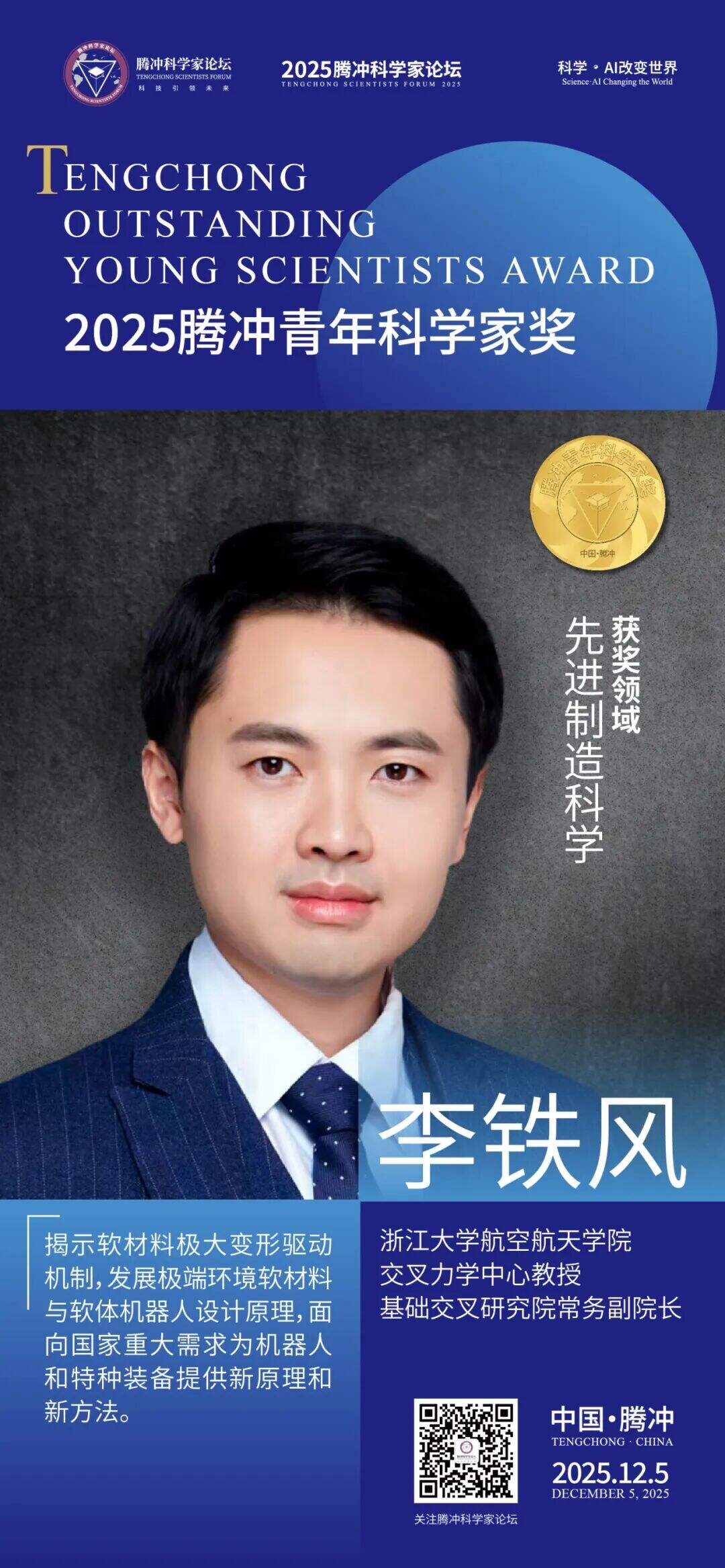 12月5日,2025腾冲青年科学家论坛在保山市腾冲市举行。论坛颁奖典礼上正式揭晓了首届“腾冲青年科学家奖”获奖者9名及提名奖获奖者9名。据了解,“腾冲青年科学家奖”主要面向40周岁以下青年科技工作者,重点表彰在基础研究、技术创新及科学普及等领域取得突出科研成果、展现卓越创新潜力的青年科学家。