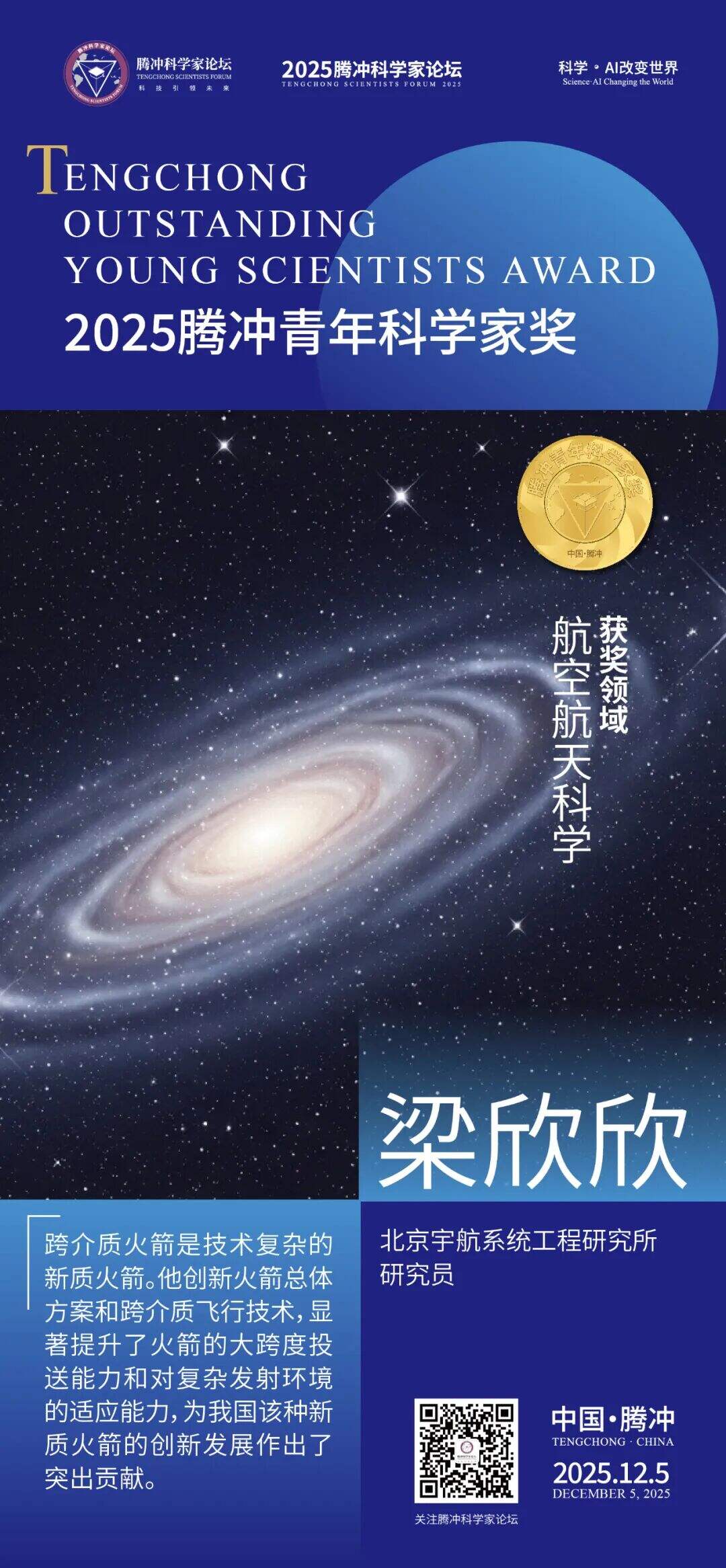 今年论坛首次在“腾冲科学大奖”体系下增设“腾冲青年科学家奖”,由云南腾冲科学家论坛中心发起,中国青年科技工作者协会提供学术指导。奖项覆盖数学物理与天文、材料科学、生命科学、医学医药、信息与智能、先进制造、生态环境与地球科学等10个方向,旨在表彰在基础科研、技术创新及科学普及等方面取得突出成就、展现卓越创新潜力的青年科学家,激发青年科研热情,弘扬科学精神,服务国家战略需求,培养科技强国生力军。