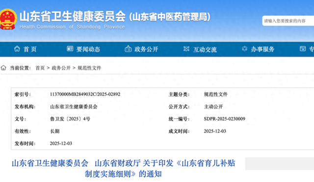 日前,山东省卫健委和省财政厅联合出台《山东省育儿补贴制度实施细则》,共七章三十一条,包括总则,补贴对象和标准,申领和审核,资金来源和补贴发放,信息管理,绩效管理和监督检查,附则等。从2025年1月1日起,符合法律法规规定生育或收养且取得山东省户籍的3周岁以下婴幼儿发放育儿补贴,至其年满3周岁。对3周岁以下孤儿、事实无人抚养的婴幼儿,予以发放补贴。