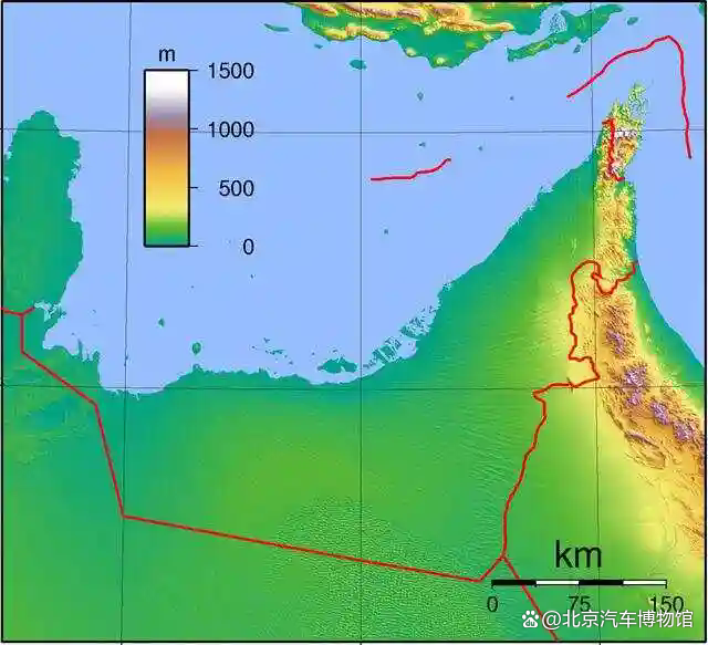 阿联酋沿海是地势较低的平原,半岛的东北部分属山地,横贯其间的哈杰尔山脉最高峰海拔2438米。此外,阿联酋绝大部分地区是海拔200米以上的沙漠和洼地。沙漠占阿联酋总面积的65%,其中有一些绿洲,以阿布扎比艾因地区的布赖米绿洲(Buraimi Oasis)面积最大。