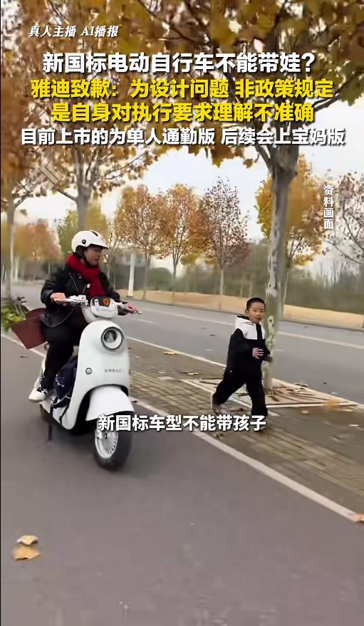 近期,网民密切关注我司“毛豆”新国标车型的问题,如“不能带小孩”、“缺乏储物空间”等,甚至引发对新国标和管理政策的质疑,其实这些都不是新国标的规定,而是对执行要求的理解不准确。我们这款车型有不同版本,旨在面向不同使用场景与人群提供精准出行方案。目前已上市的为“单人通勤版”,主要服务于日常单人通勤群体,侧重解决基础出行需求。此外,同系列产品还包括“时尚版”与“亲子宝妈版”,分别在造型设计、骑行体验以及安全性、实用性等方面进行针对性优化,以覆盖更多用户群体,后续也将陆续上市。但之前在不同版本上市节奏上缺乏有效衔接,在车型设计上也有一些考虑不周的地方,给一直期待不同需求的消费者带来了不便与困扰,我们深表歉意。雅迪始终坚持以用户为中心,将继续加快产品布局与迭代,围绕真实出行场景,打造更安全、更实用、更贴心的电动自行车产品。